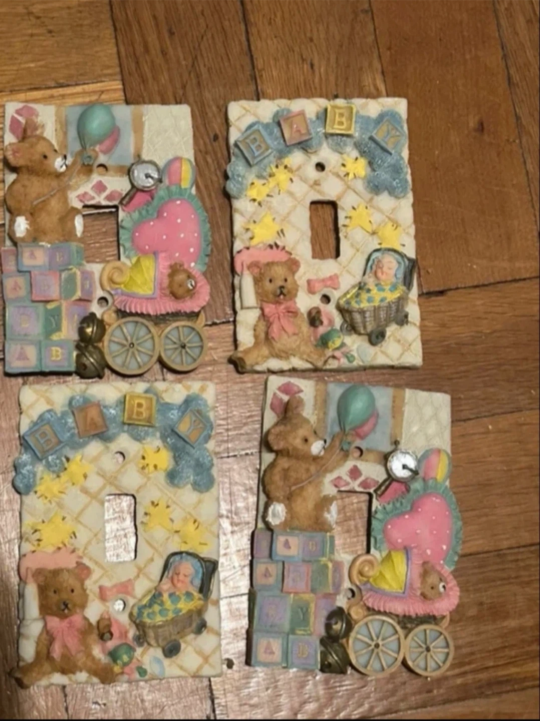 These decorative light switch covers feature adorable teddy bears and baby-themed designs. They're perfect for a nursery or child's room! Each cover has a unique, whimsical look with pastel colors and playful accents. Price for one just showing options