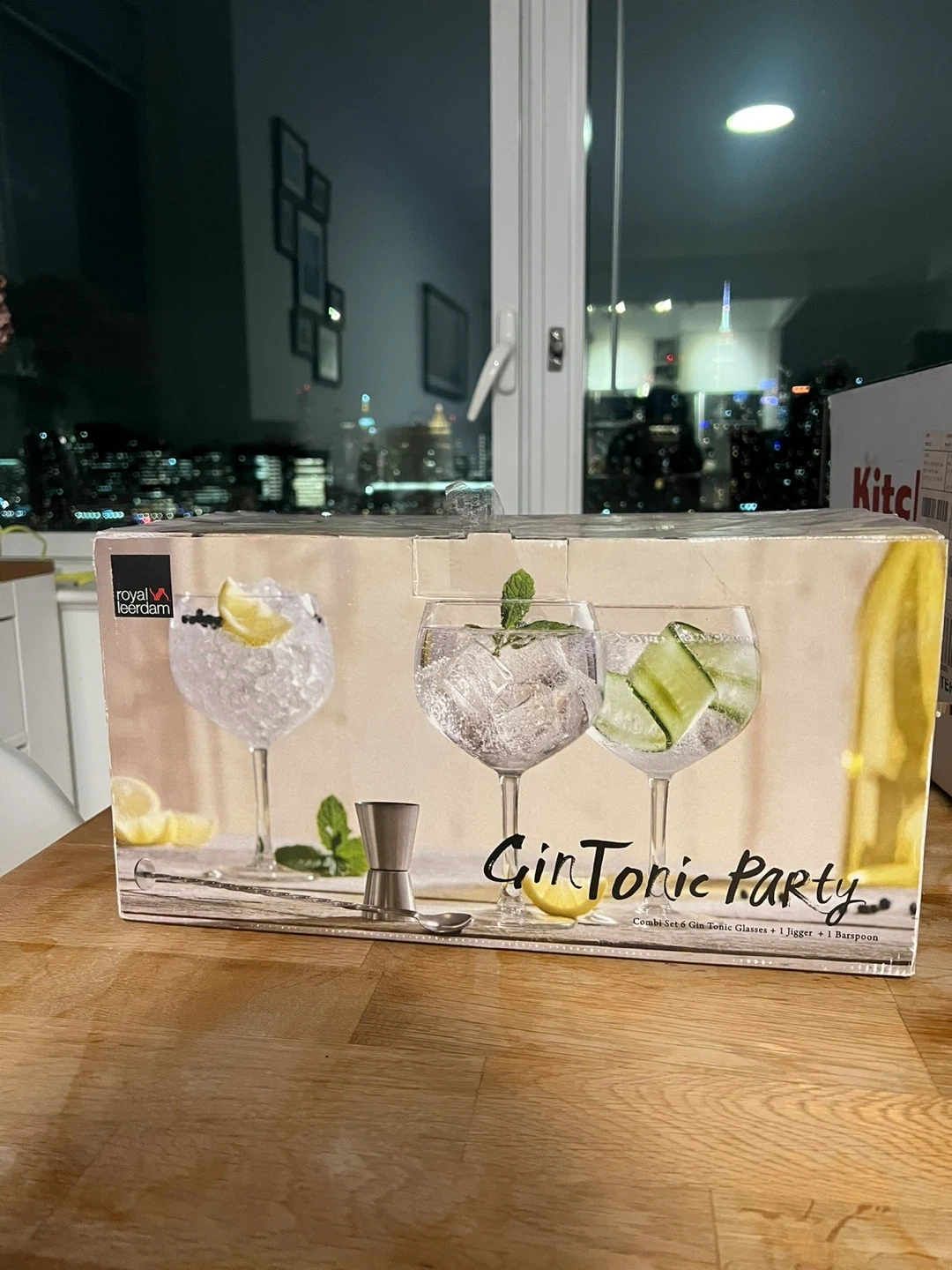 This set includes six Royal Leerdam Gin Tonic glasses. It also comes with a jigger for measuring and a bar spoon for mixing. Everything needed for a gin tonic party is included! Got as gift - never used.