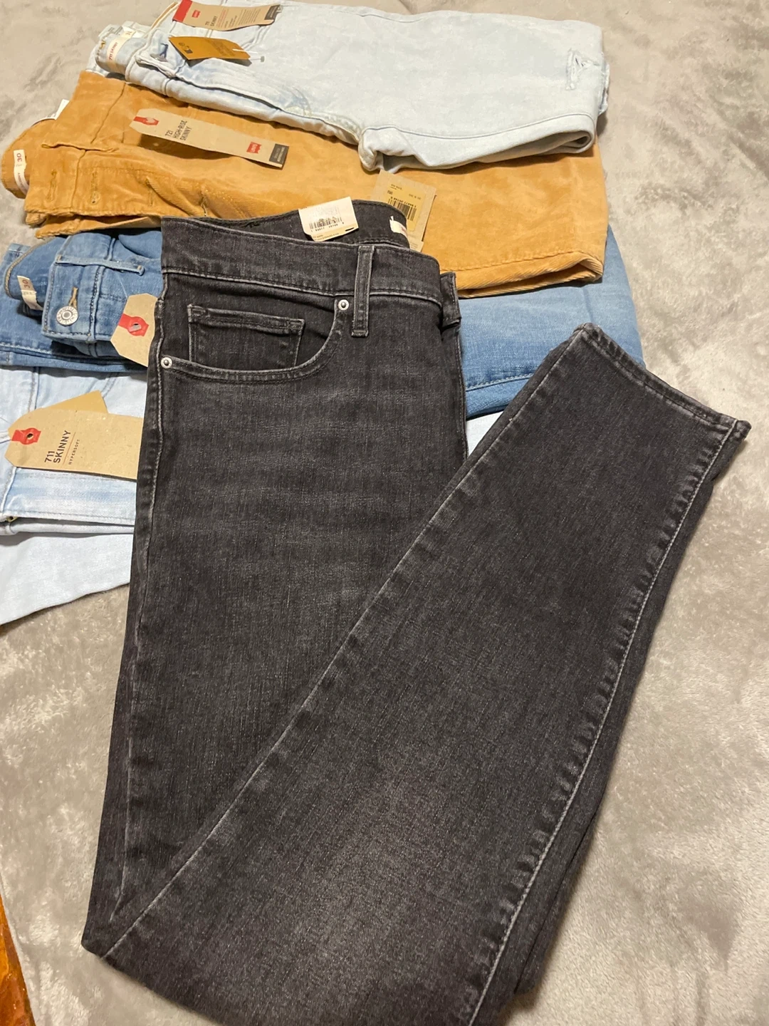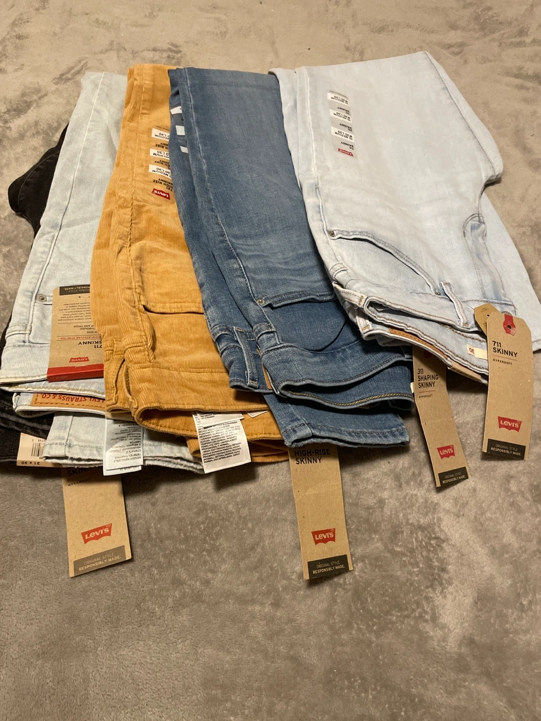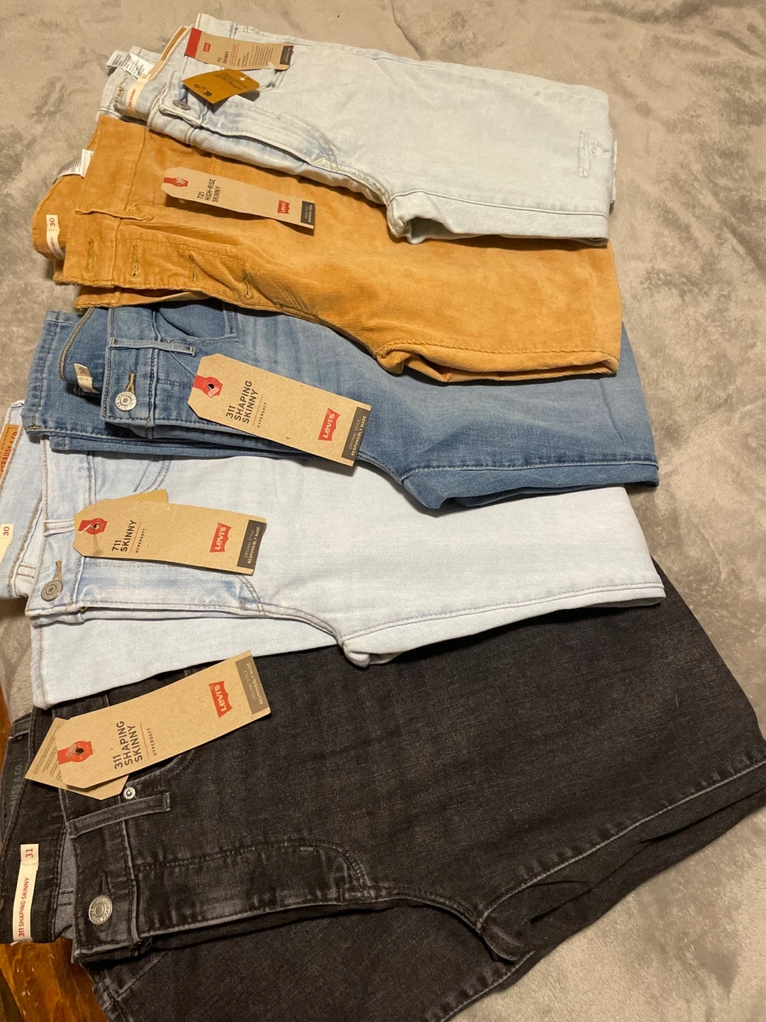 Five pairs of Levi's 311 Skinny Jeans 711 skinny jeans 721 high-rise in assorted washes. Includes light wash denim, medium wash denim, light blue denim, light grey denim, and a mustard yellow corduroy style. All are new with tags and in skinny fit. Perfect for everyday wear!