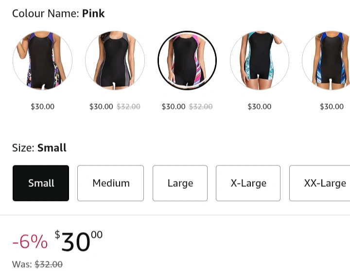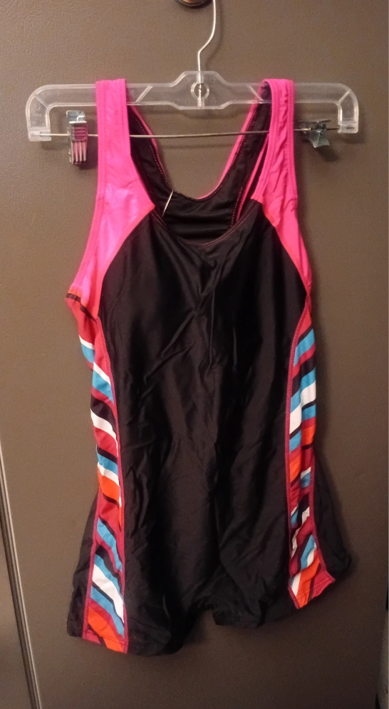 Women's athletic one-piece swimsuit. Small size. Black and pink colour scheme. Full coverage. Features tummy control and built-in shorts. Racerback style.