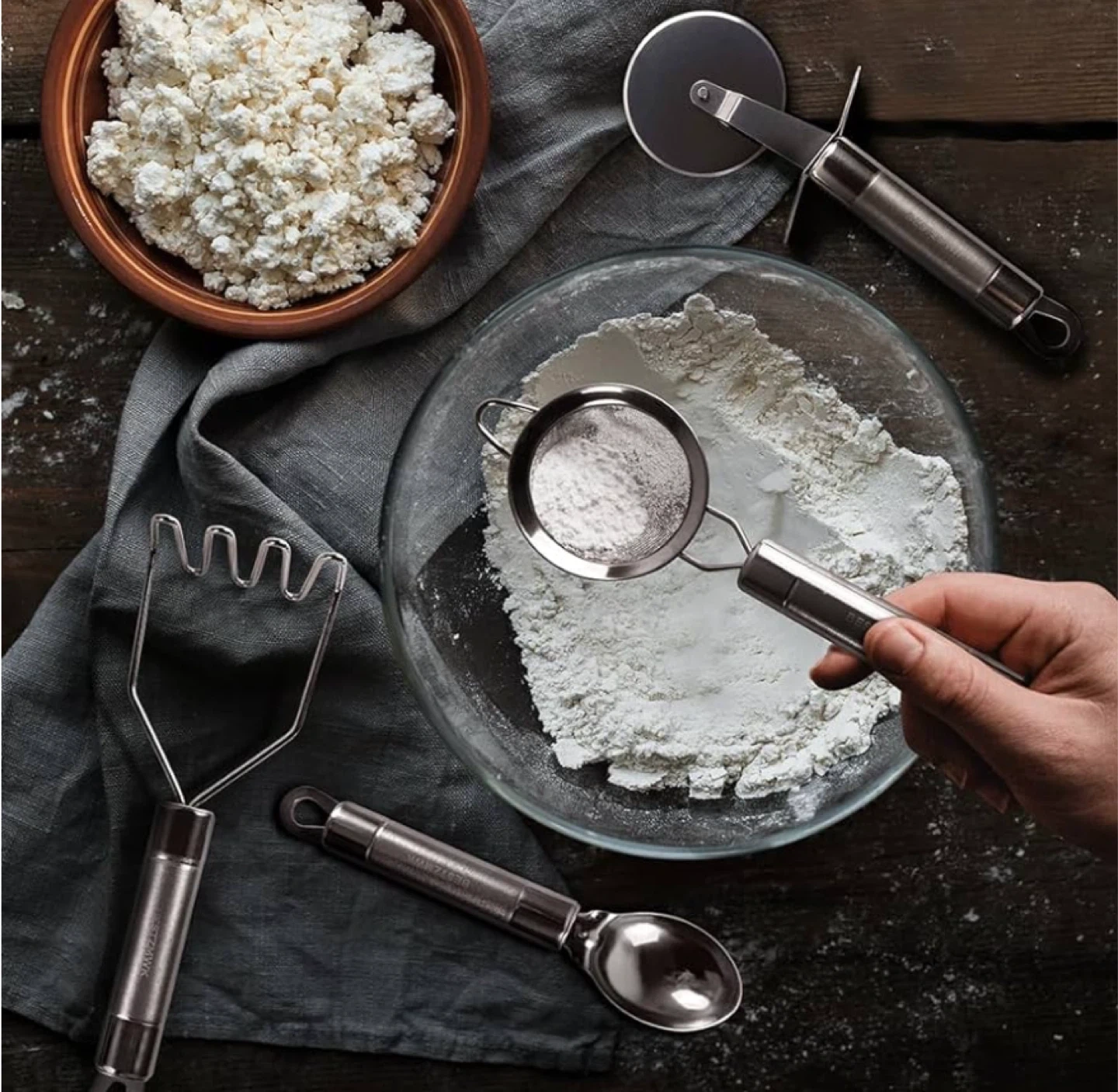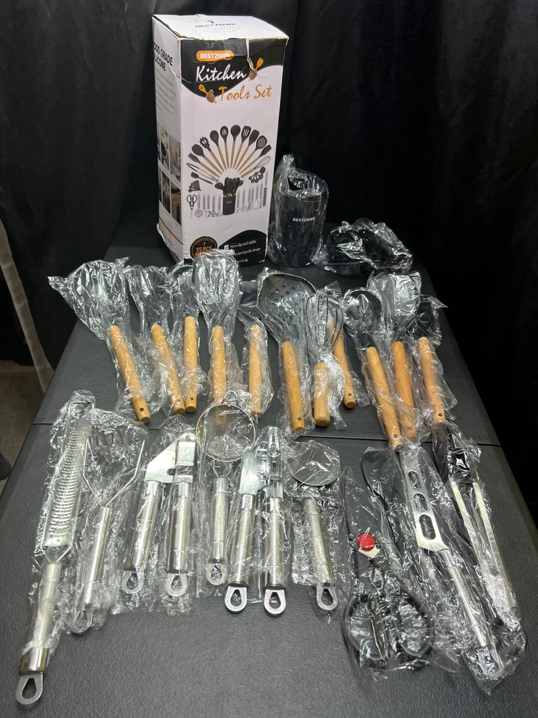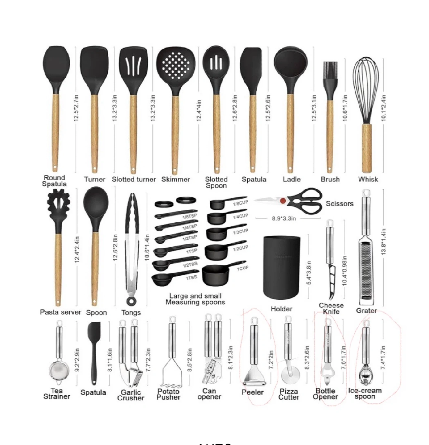 35 COOKING UTENSILS - Utensil Set includes everything you need to cook that perfect dish,includes Slotted Spatula ,Slotted Spoon,Flexible Spatula,Slotted Turner, Solid Turner, Pasta Server,Solid Spoon, Kitchen Tongs, Draining Spoon, Whisk ,Deep Soup Ladle,Spatulas,Brush,Pizza Cutter,Potato,Pusher,Can opener,Grater,Scissors,measuring cups and spoons set,Hooks,Tea strainer,Garlic crusher,Cheese knife,Spatula,Holder