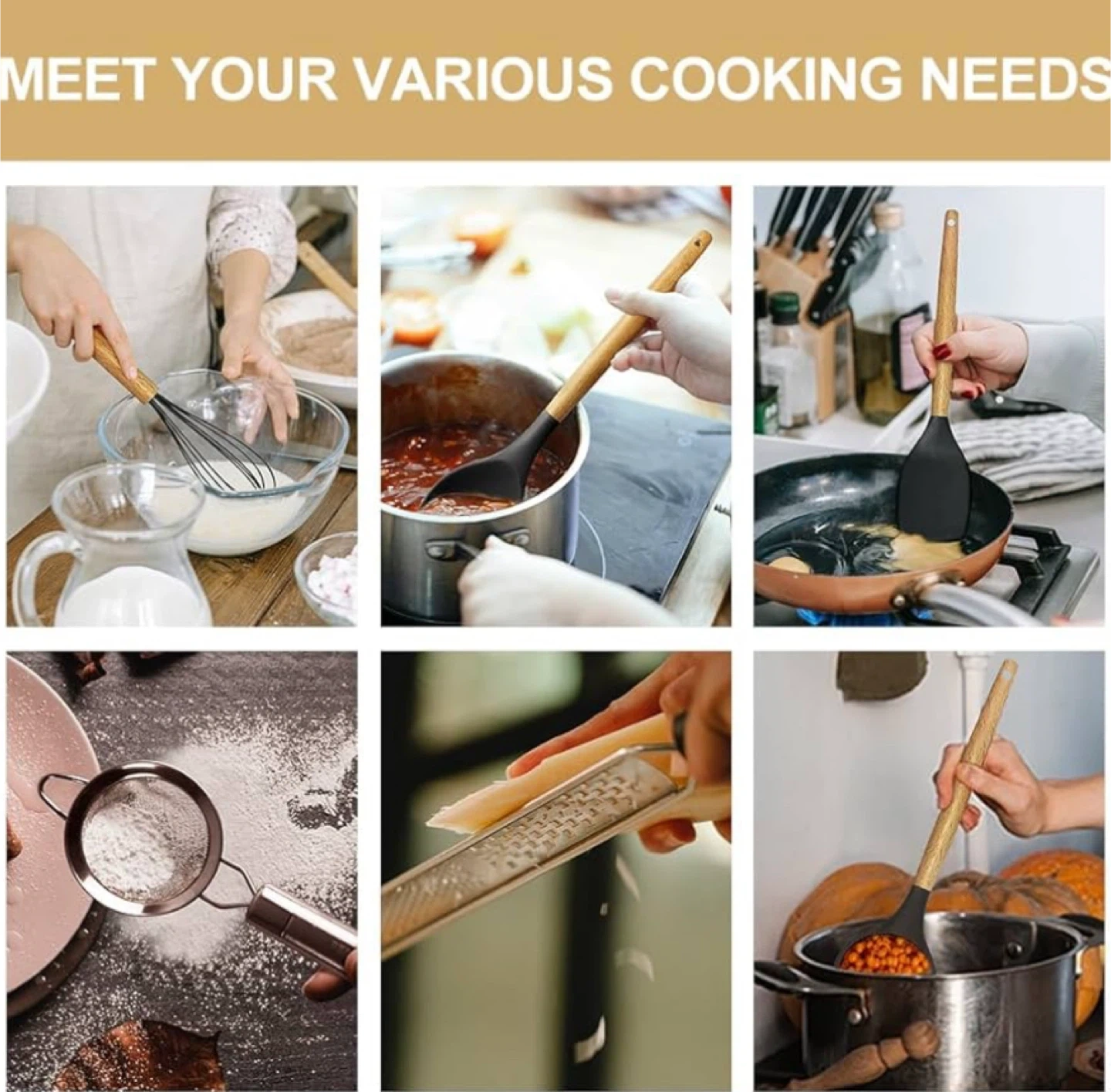 THE WOODEN HANDLE IS ANTI-SCALDING.THE SILICONE SOFT AND DOES NOT HURT THE POT - This kitchen utensil handle is made of solid wood. Smooth and comfortable to the touch, it completely prevents the heat transfer during the cooking process. Avoid scalding the chef's hands. Deep Soup Ladle, Solid Serving Spoon, Slotted Spoon, Flexible Spatula, Round Spatula, Pasta Server, Slotted Turner, etc. are made from food grade silicone. No warping, soft, completely protect your pot from being scratched.