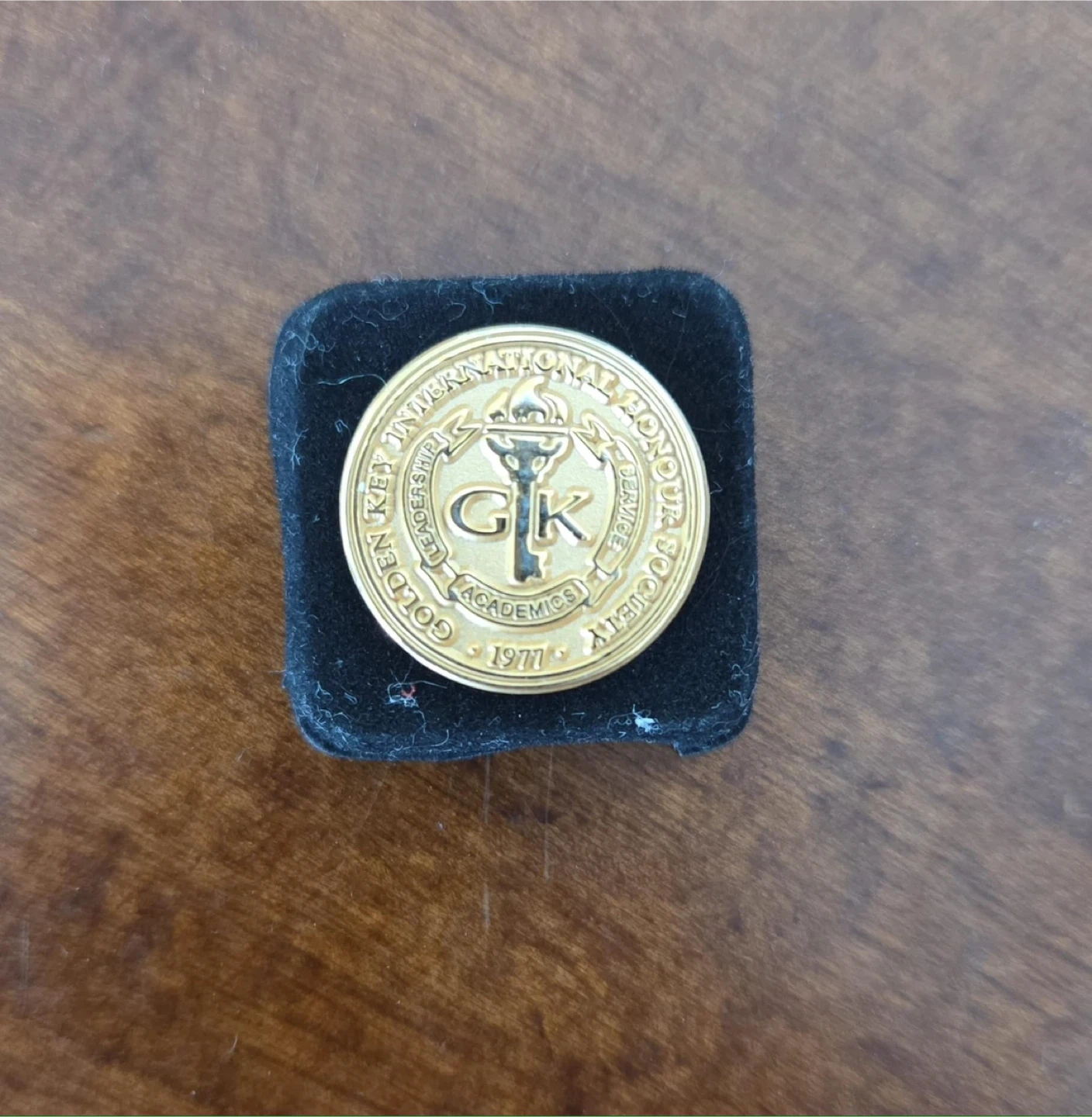 Official Golden Key International Honour Society pin featuring the classic torch and “GK” emblem with “Leadership • Academics • Service” and 1977 detail.