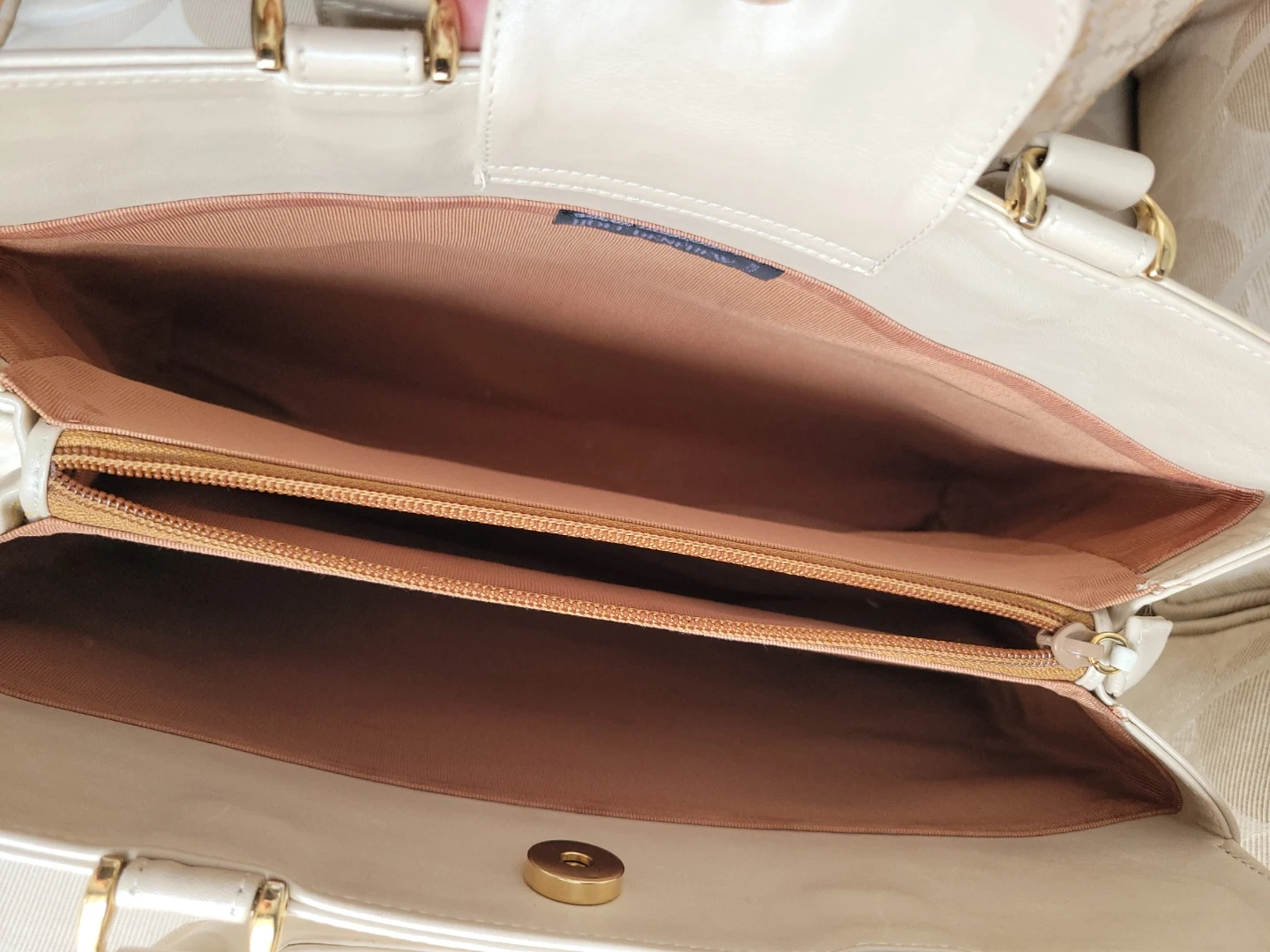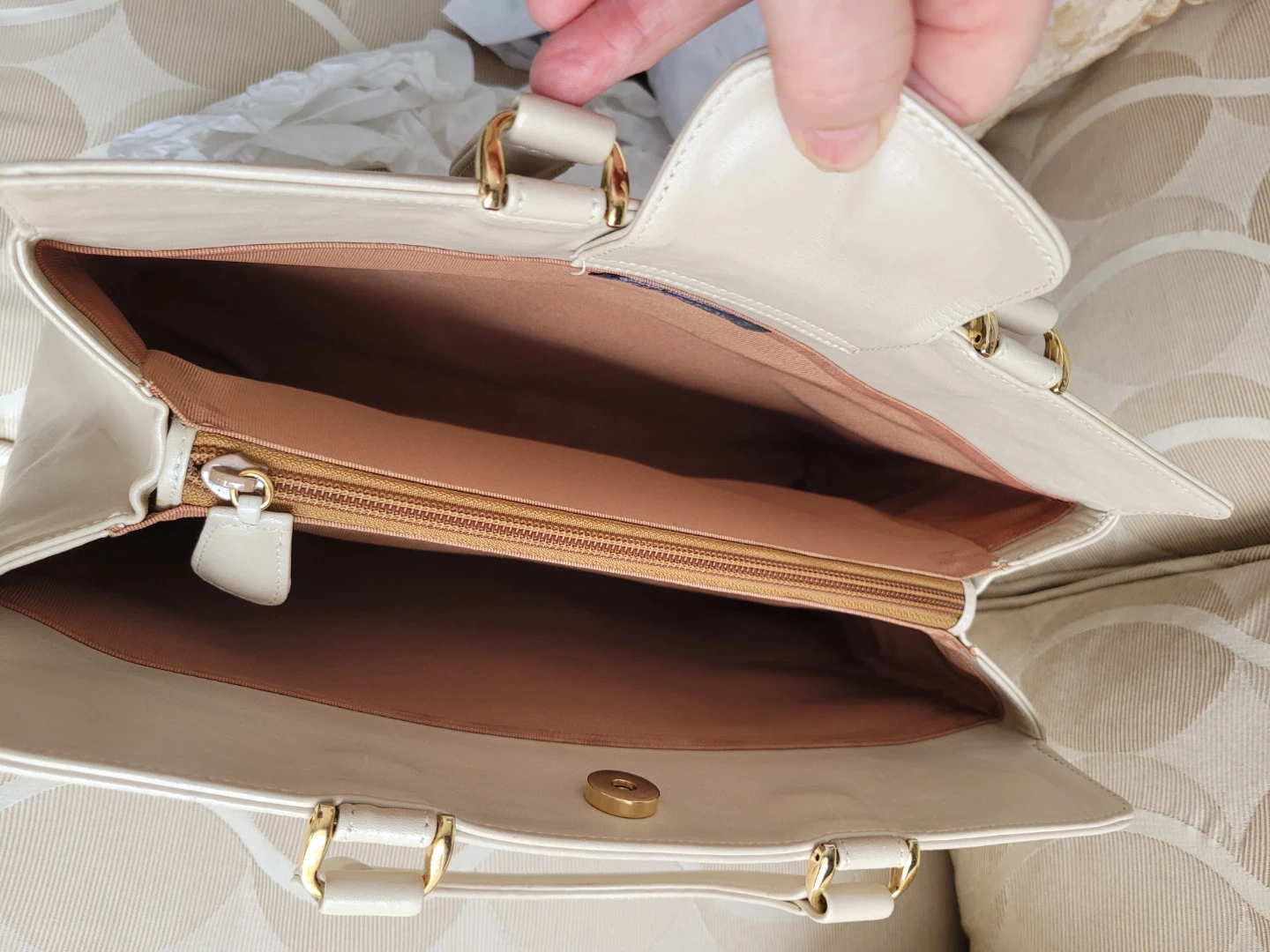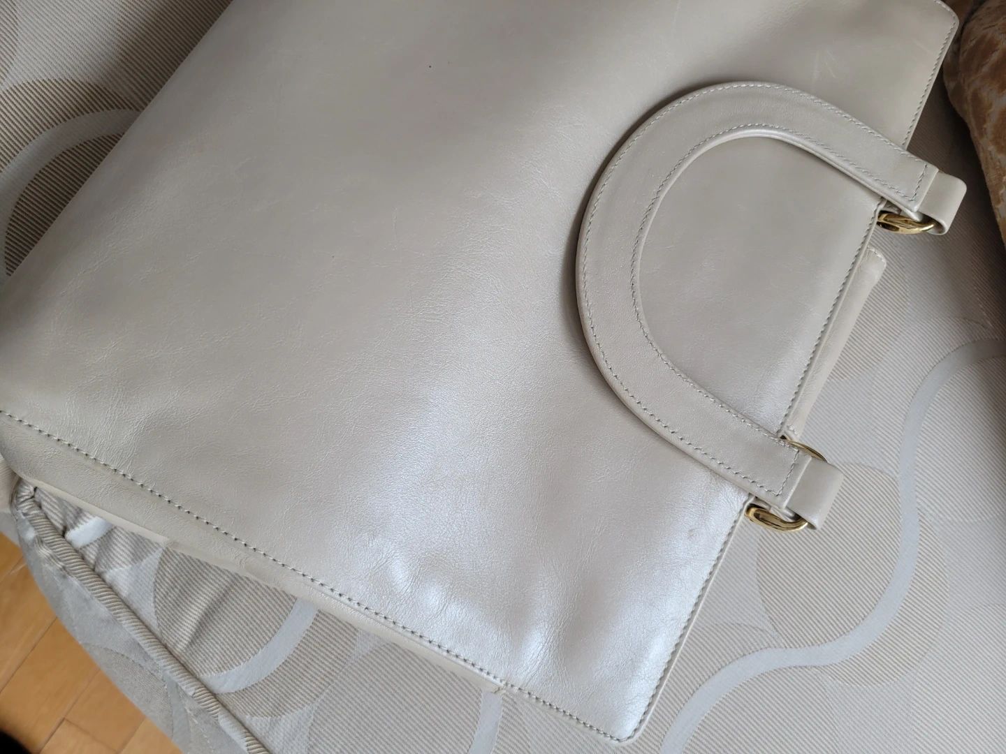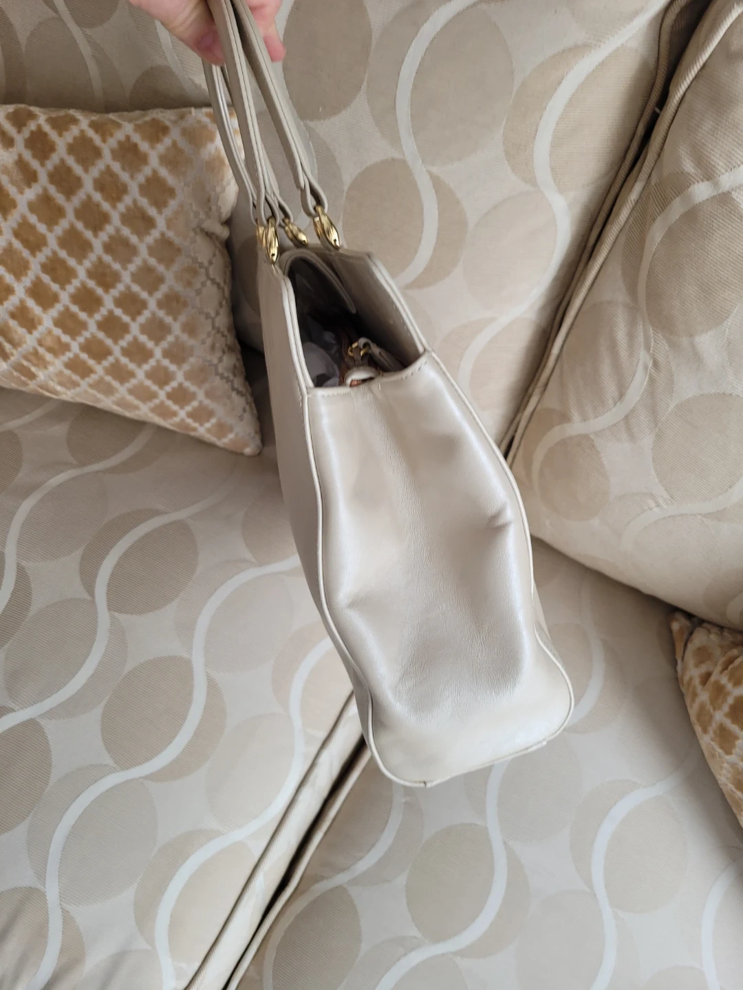 This is a classic super vintage pearlized cream leather top-handle handbag by