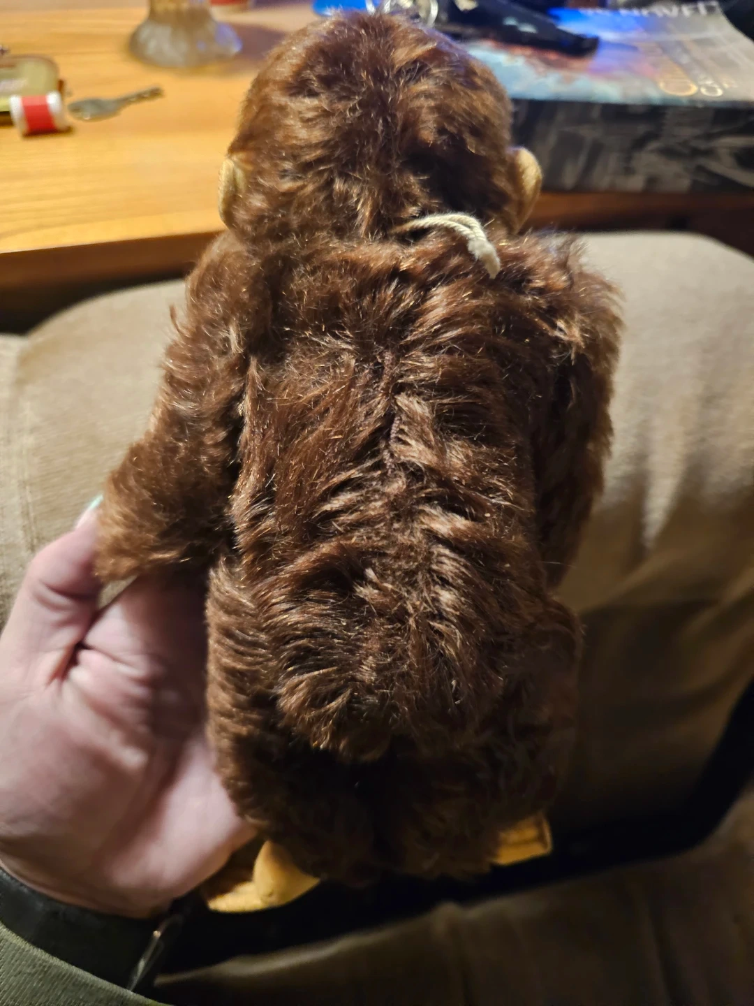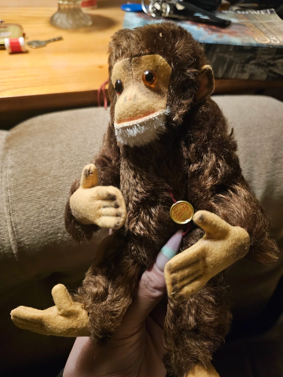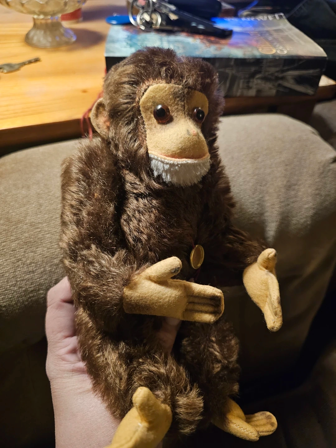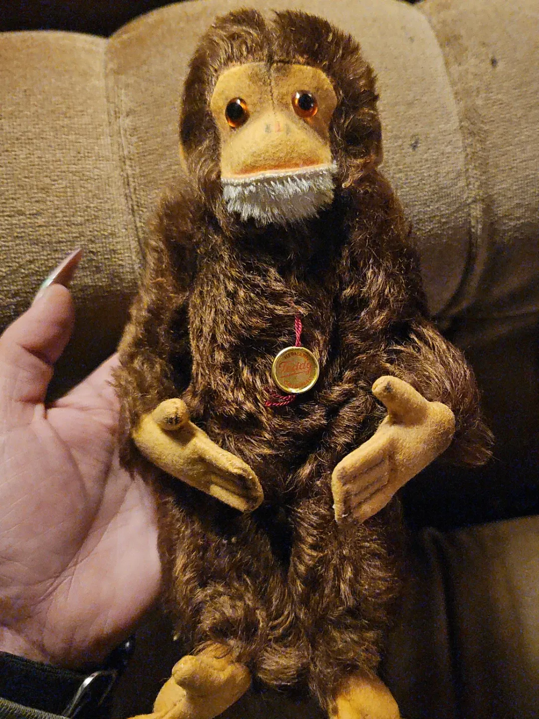 The Hermann monkey is articulated, limbs and head, it has a closed mouth, its 2 hazel eyes are present, the belly sound works.