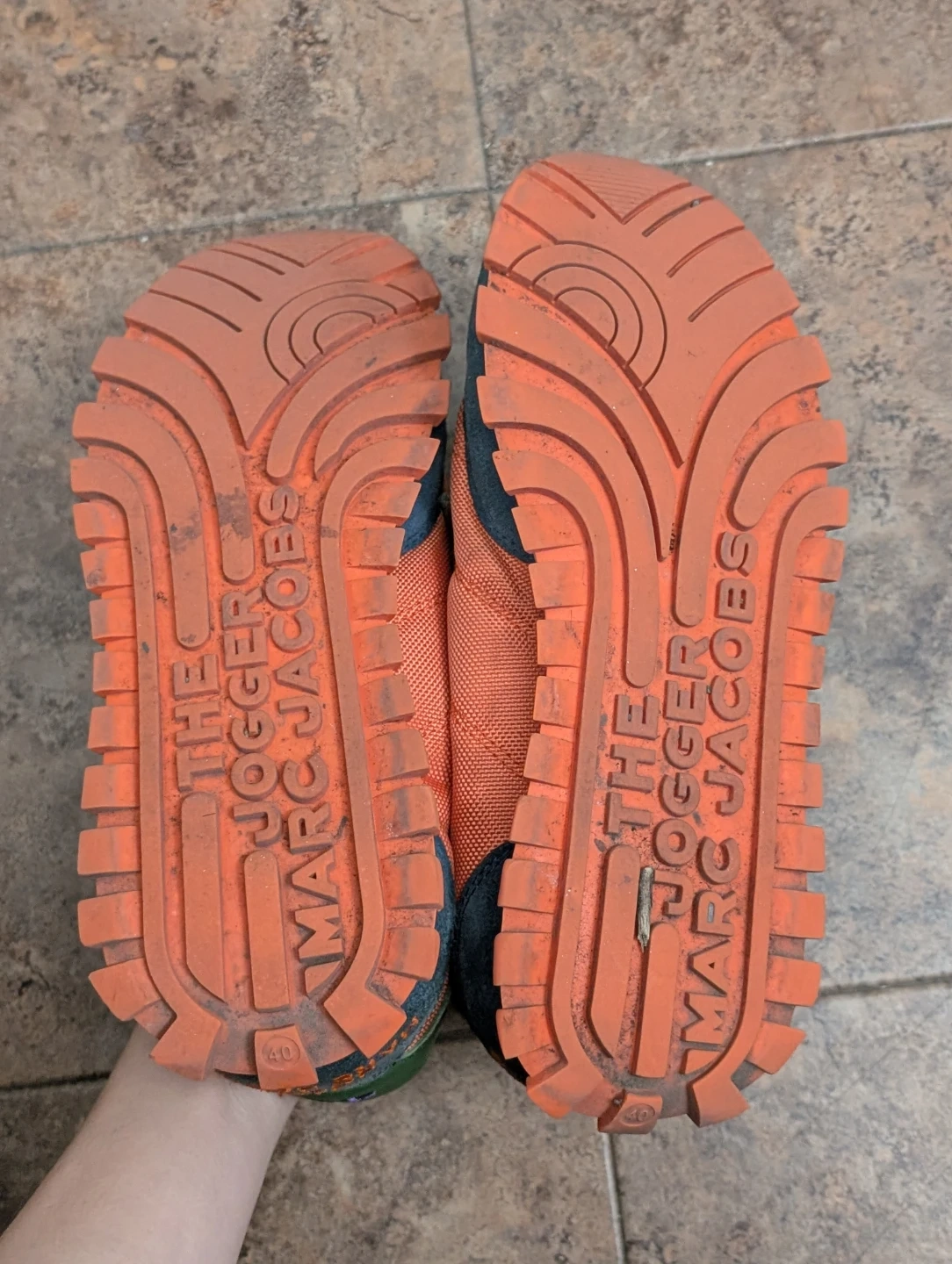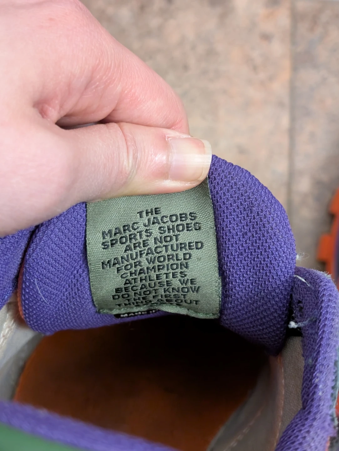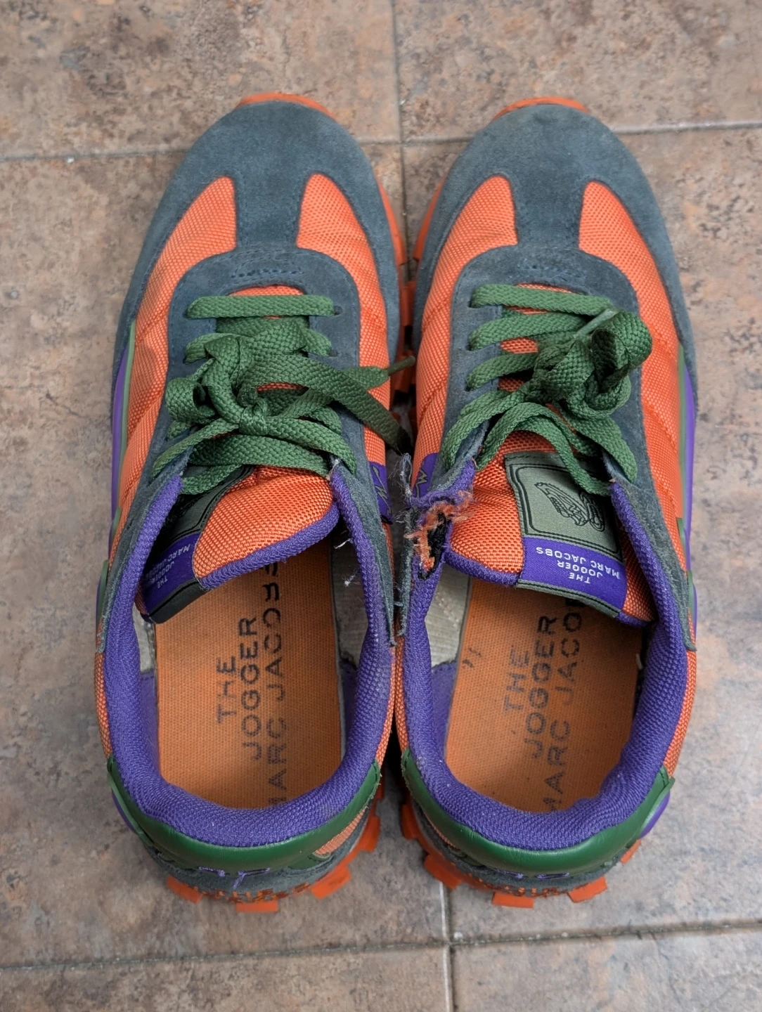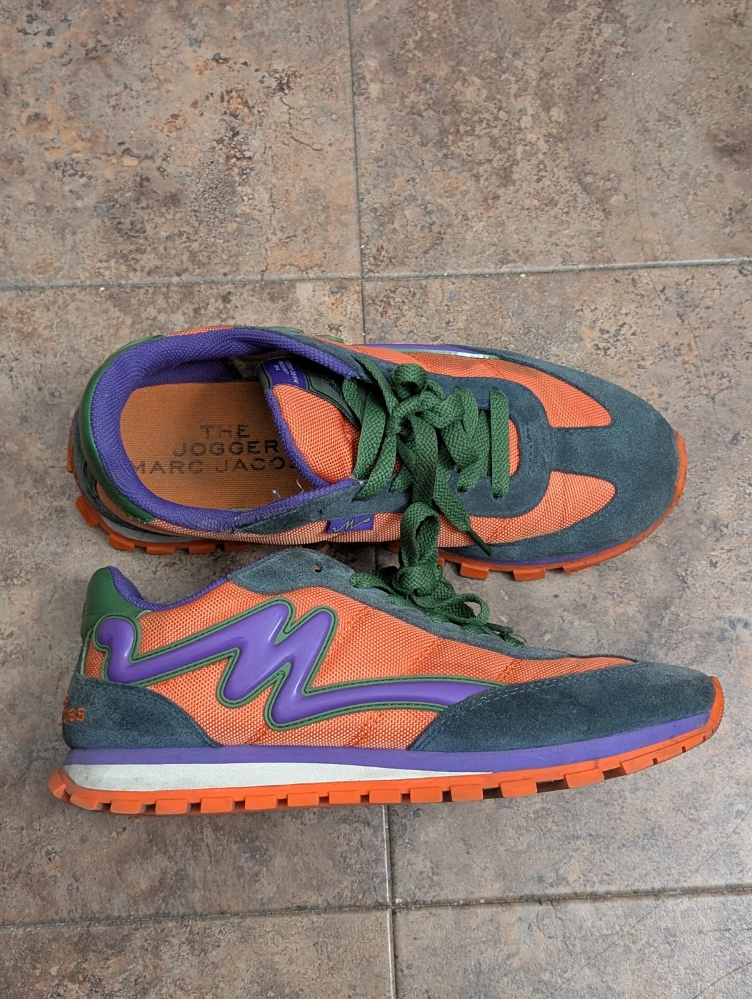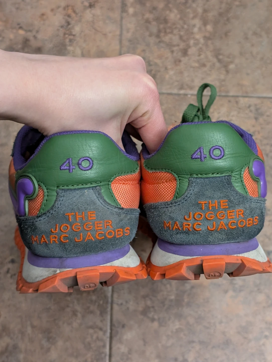 Marc Jacobs The Jogger sneakers in orange, green, and purple. Size 40. These are athletic-style shoes with a suede and nylon upper. Retailing at $200+ For you to show off
