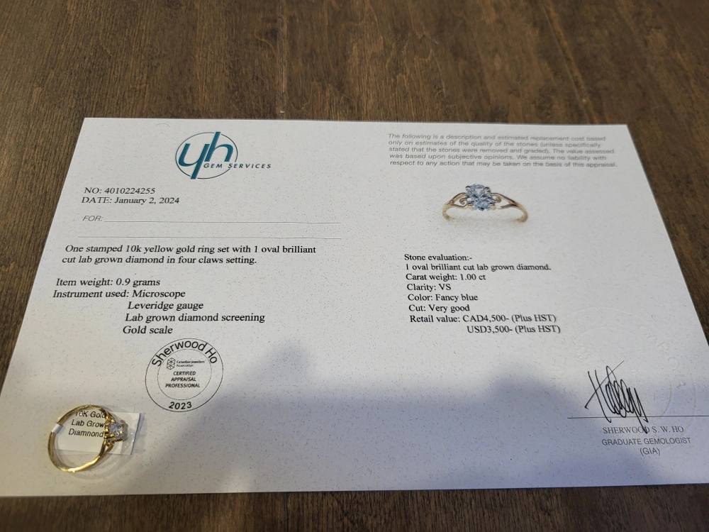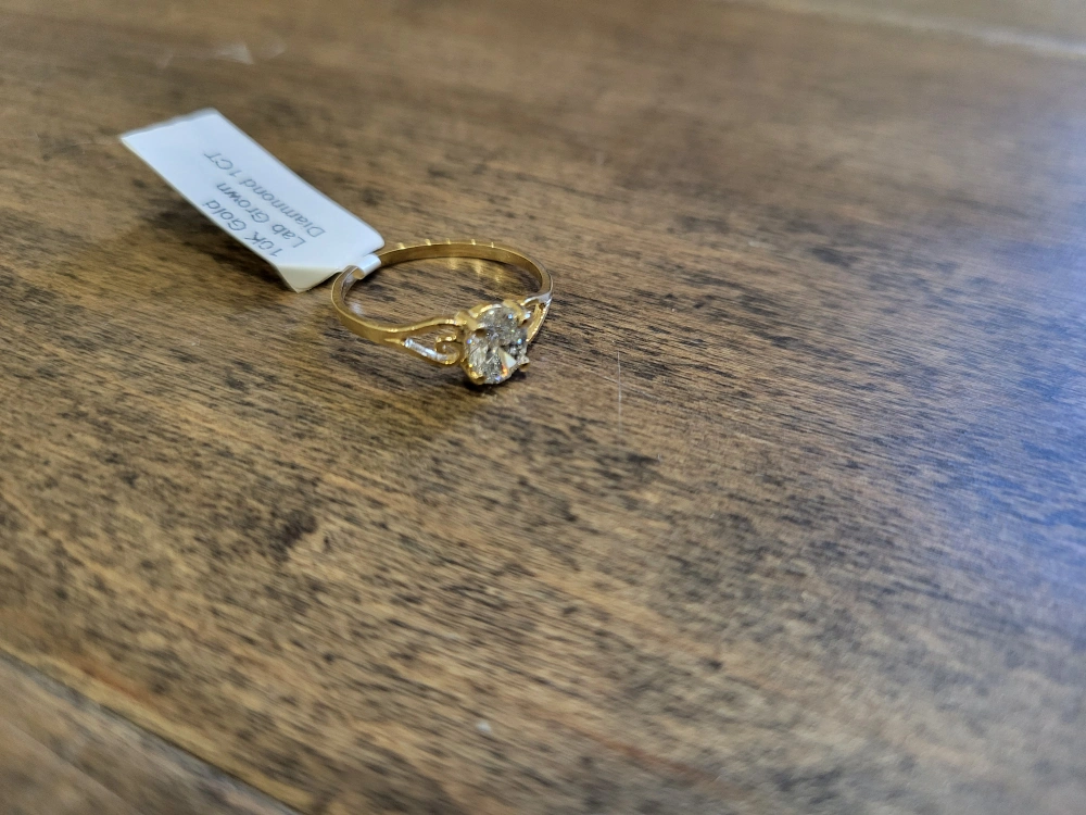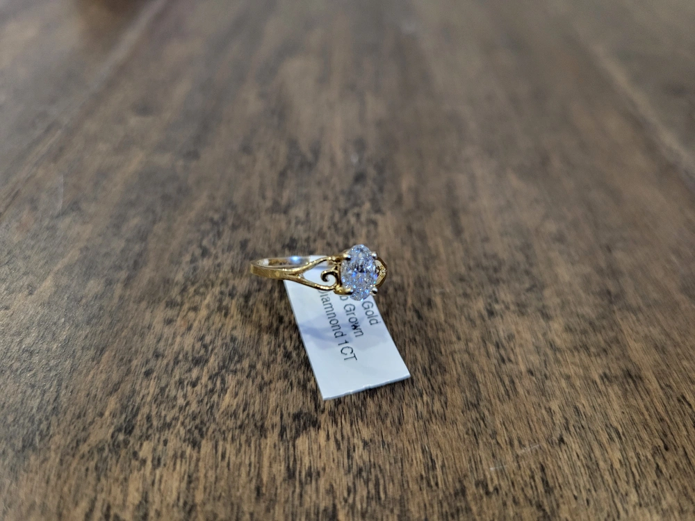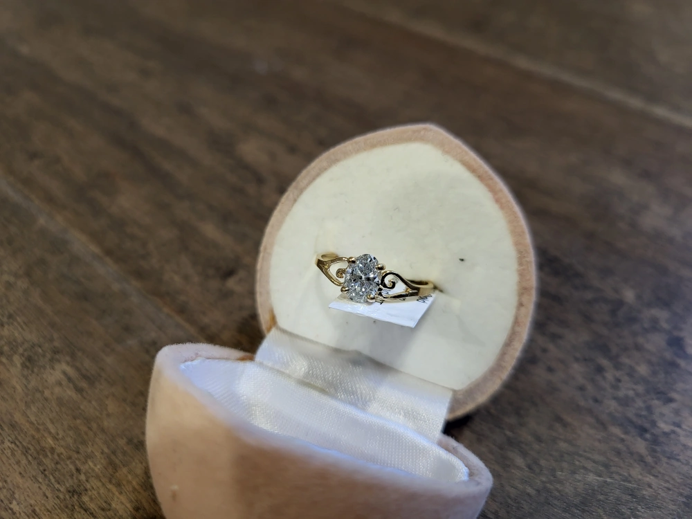 Gold band. Oval-cut diamond. Comes with a ring box. 10kt yellow gold diamond ring, 1.00 carat, made in Canada, comes with appraisal.