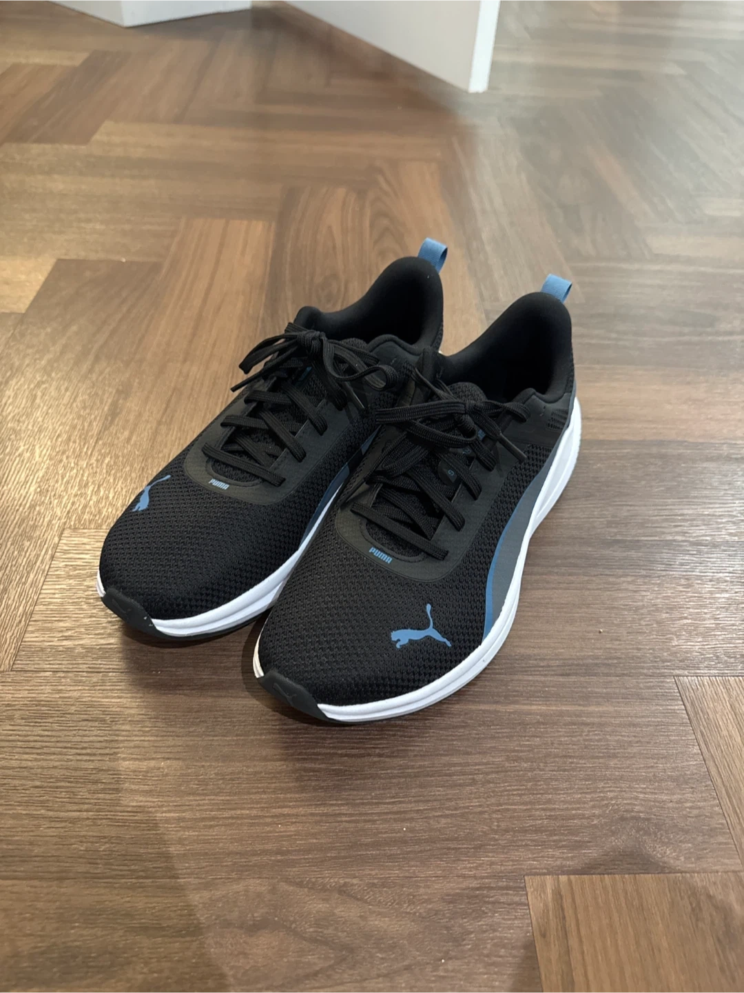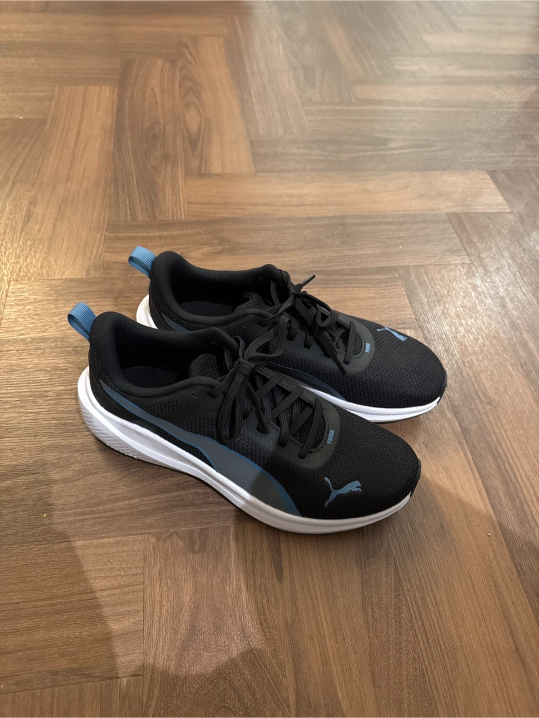 Puma running shoes in black with blue accents. These shoes have a breathable mesh upper and a comfortable sole. They're great for everyday wear or hitting the gym!
