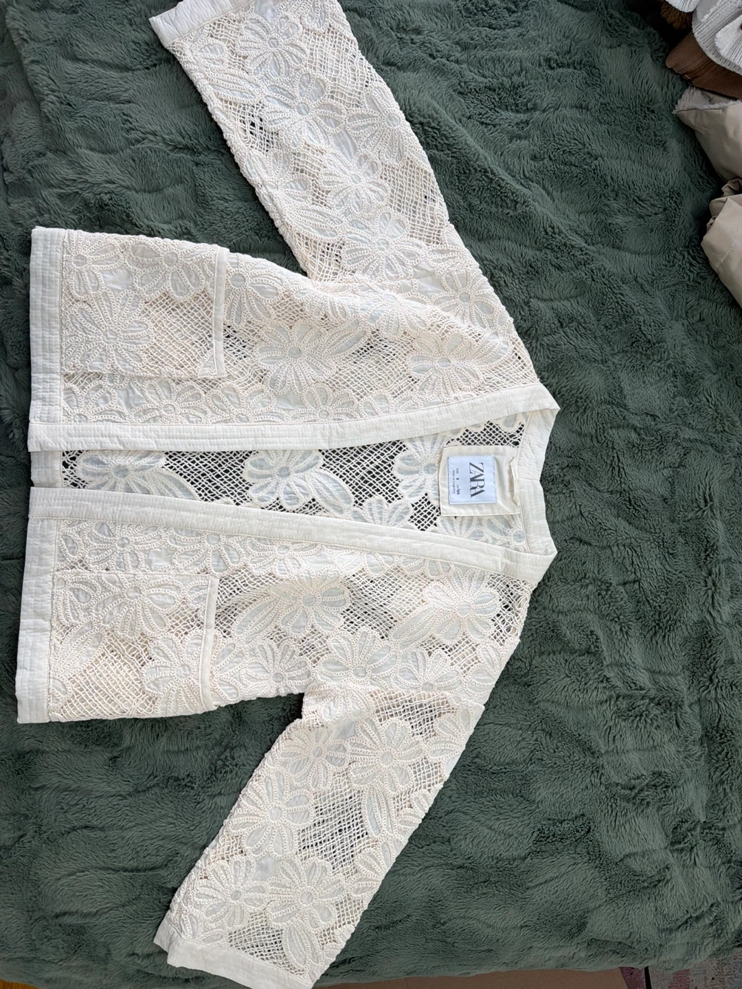Cream crochet jacket from ZARA with all-over floral pattern. Features two front pockets and a lightweight, open knit design. This piece adds a delicate touch to any outfit! Kids size S for girls