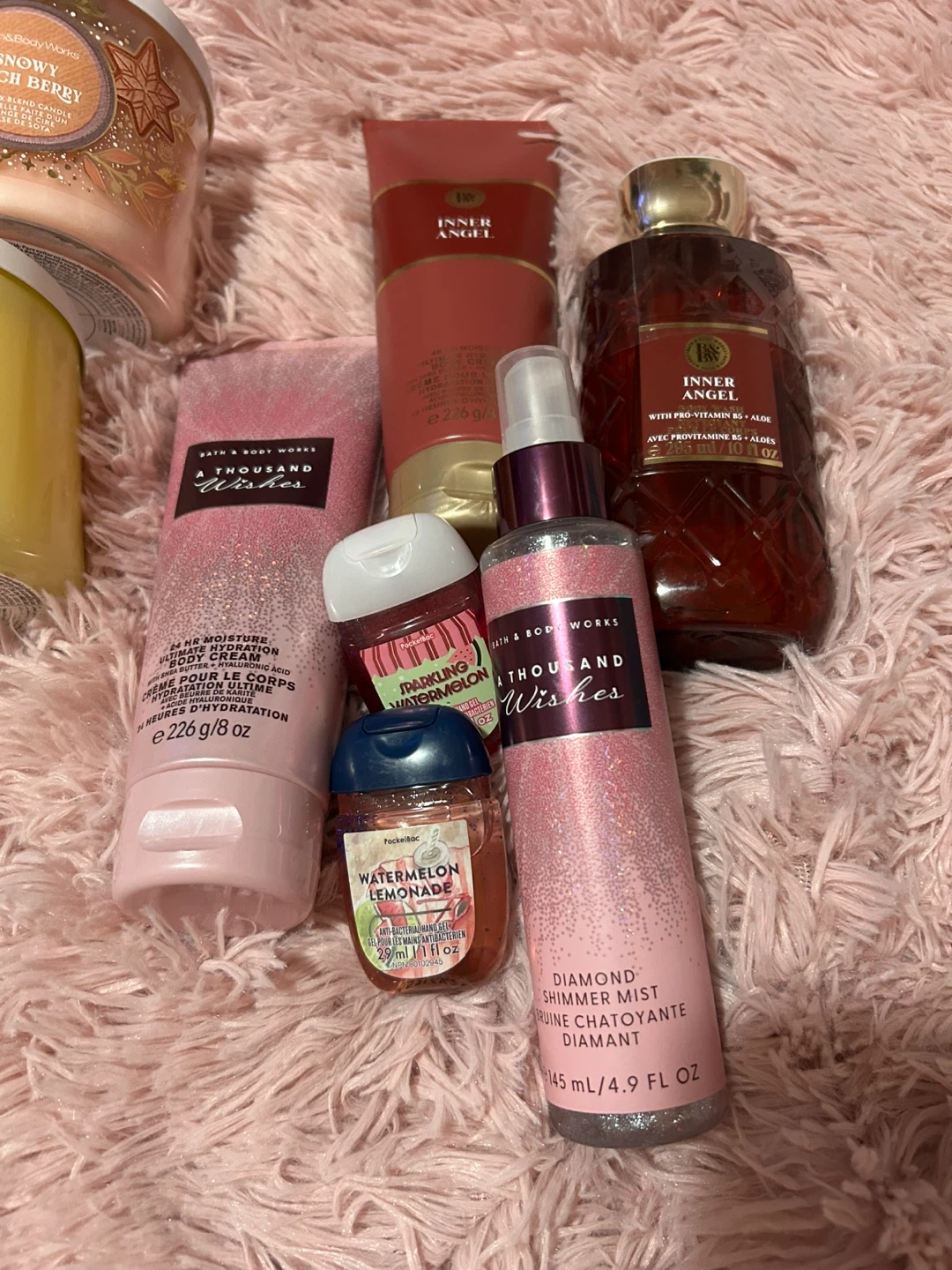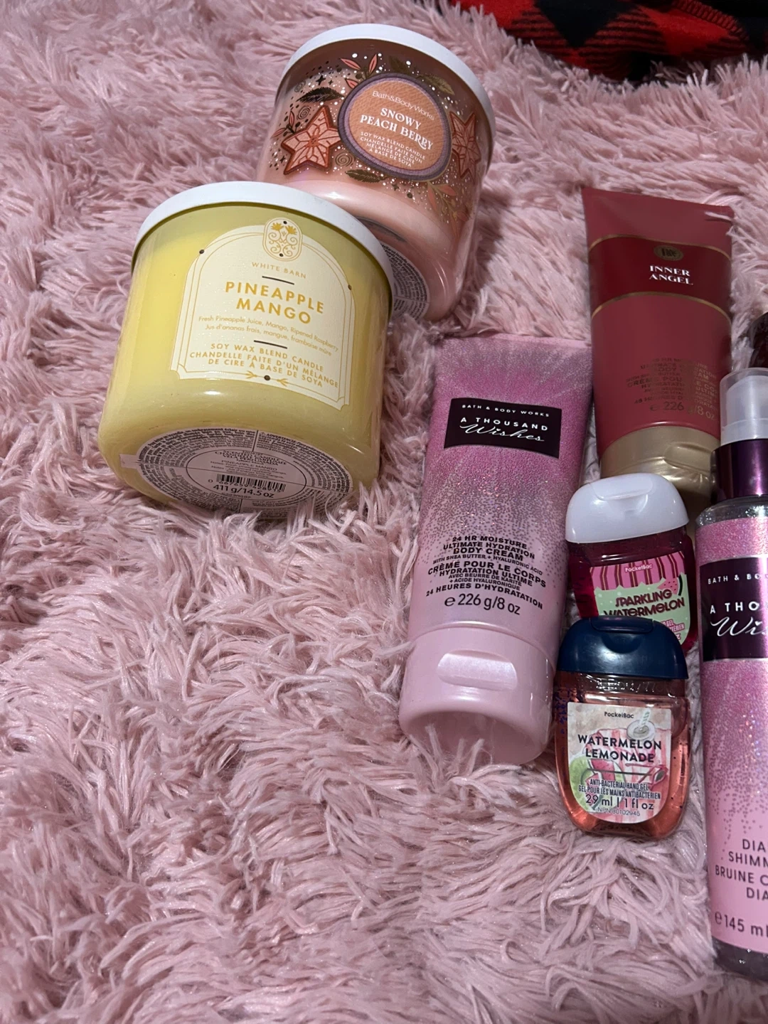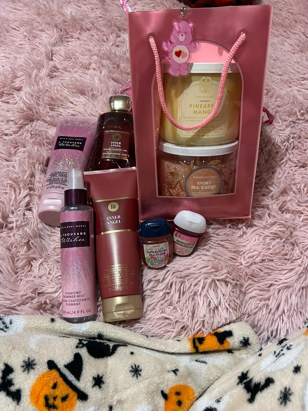 Includes White Barn Pineapple Mango and Snowy Peach Berry 3-wick candles. Also features A Thousand Wishes body lotion and diamond shimmer mist, Inner Angel body lotion and shower gel, and two Pocketbac sanitizers in Watermelon Lemonade and Sparkling Watermelon. Perfect for a gift or personal pampering! The care bear keychain is super cute for valentine’s day!