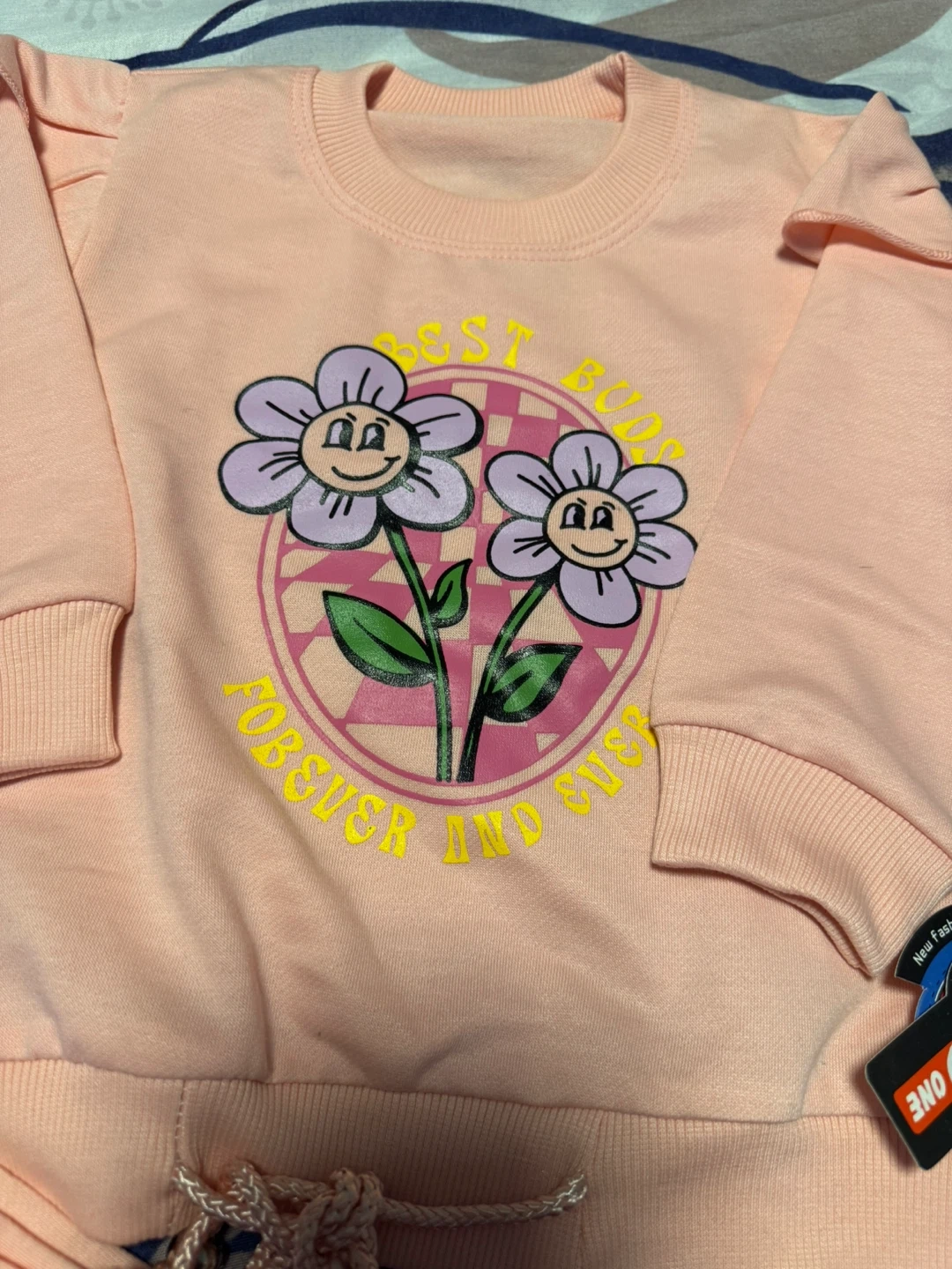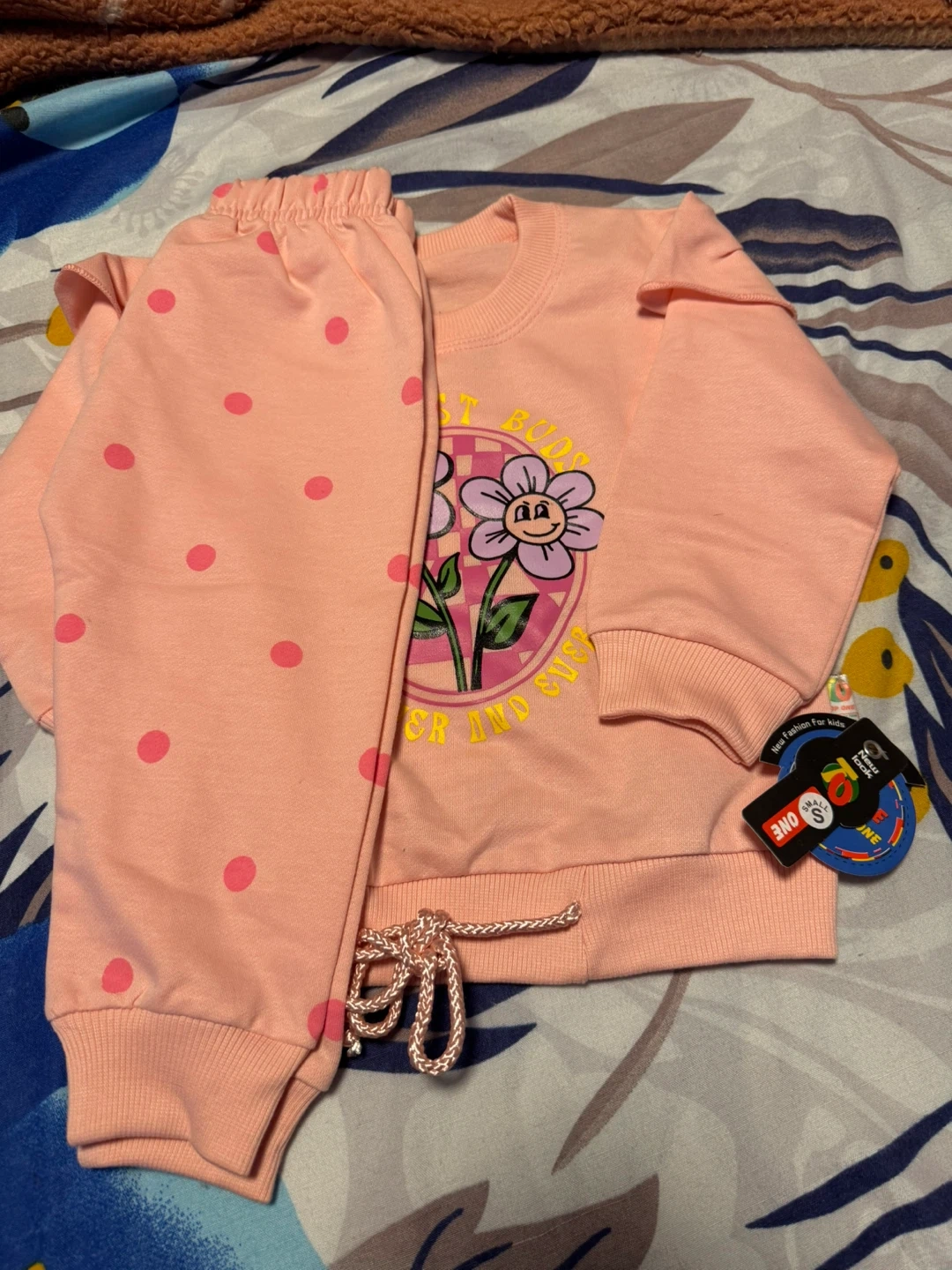 This cute pink set includes a long-sleeved sweatshirt with a fun floral graphic and matching polka dot pants. It's got ruffle details on the sleeves! The drawstring on the pants is a lovely pink.
