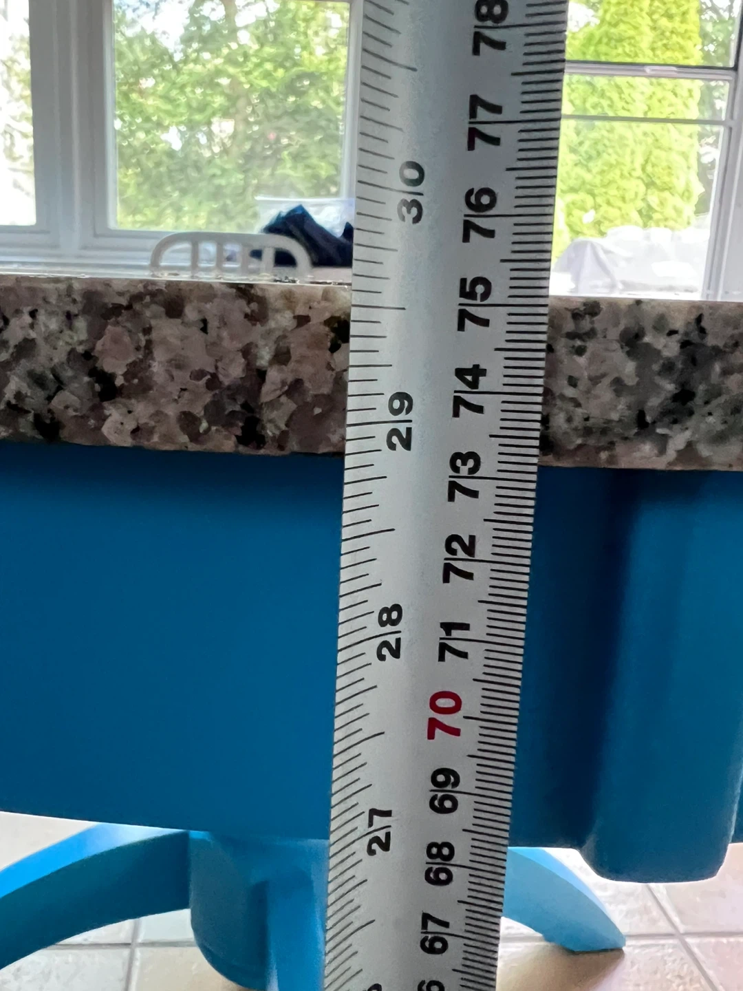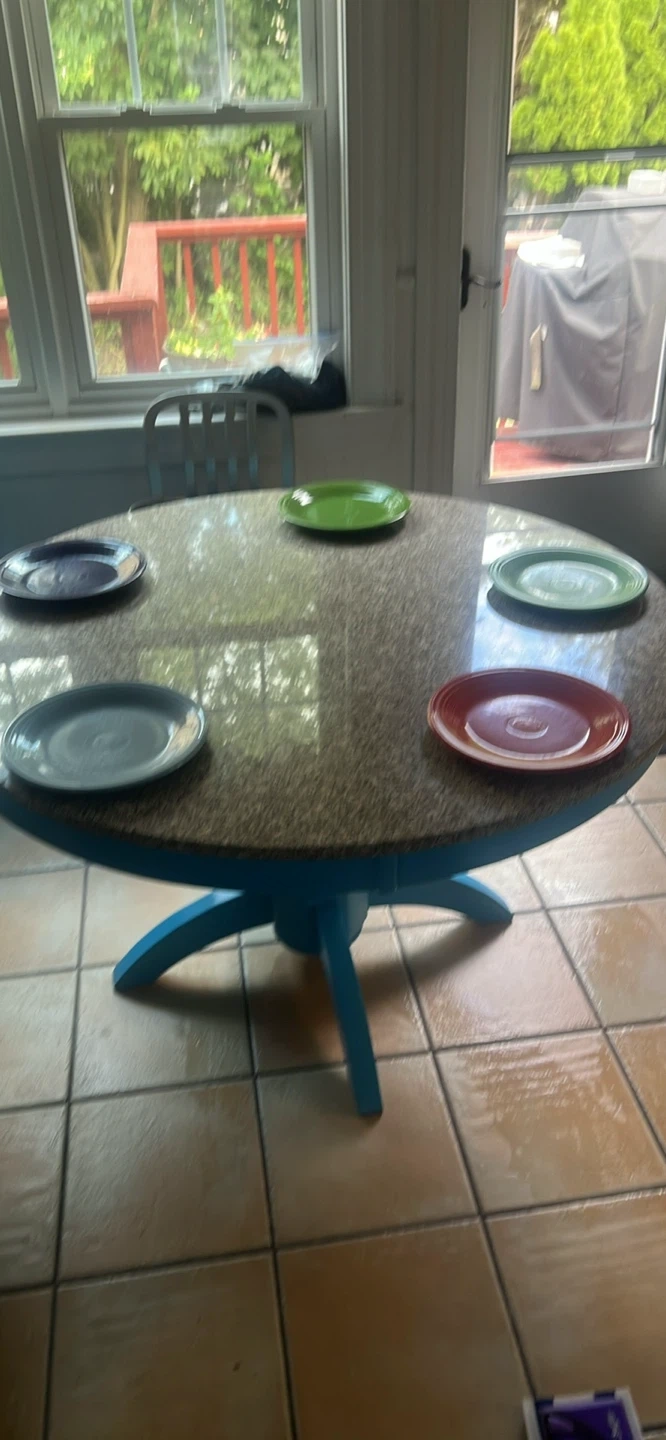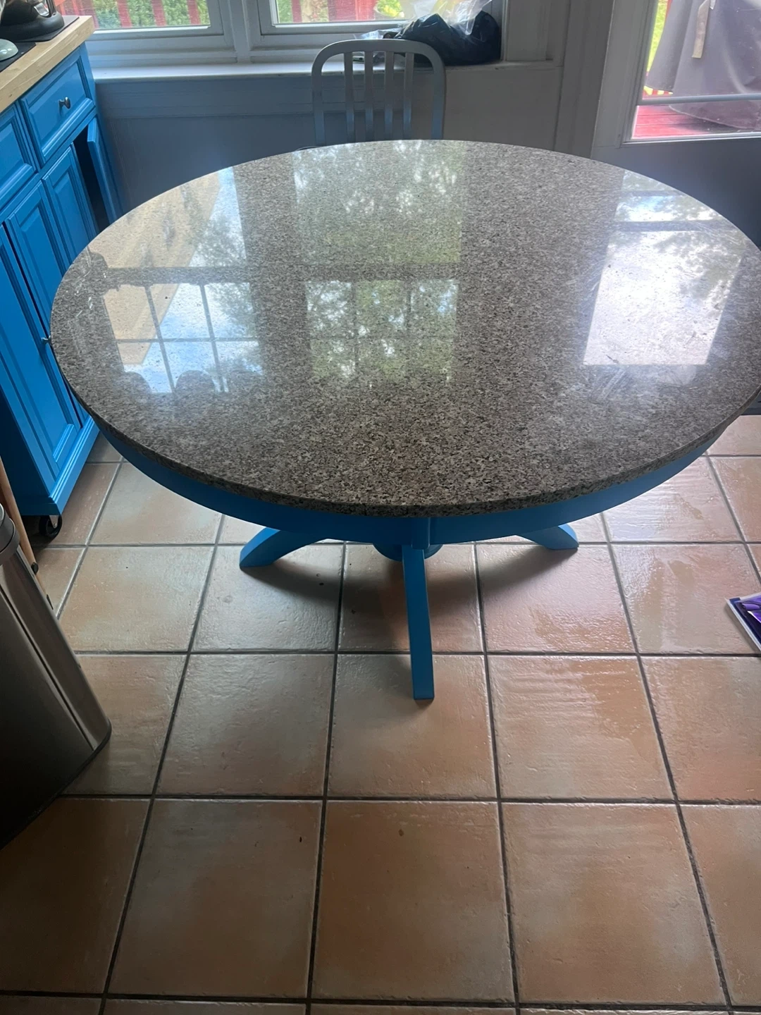 This round dining table features a durable granite top and a vibrant blue pedestal base. It's about 48 inches in diameter. The table's height is approximately 30 inches. It's a great size for family meals.