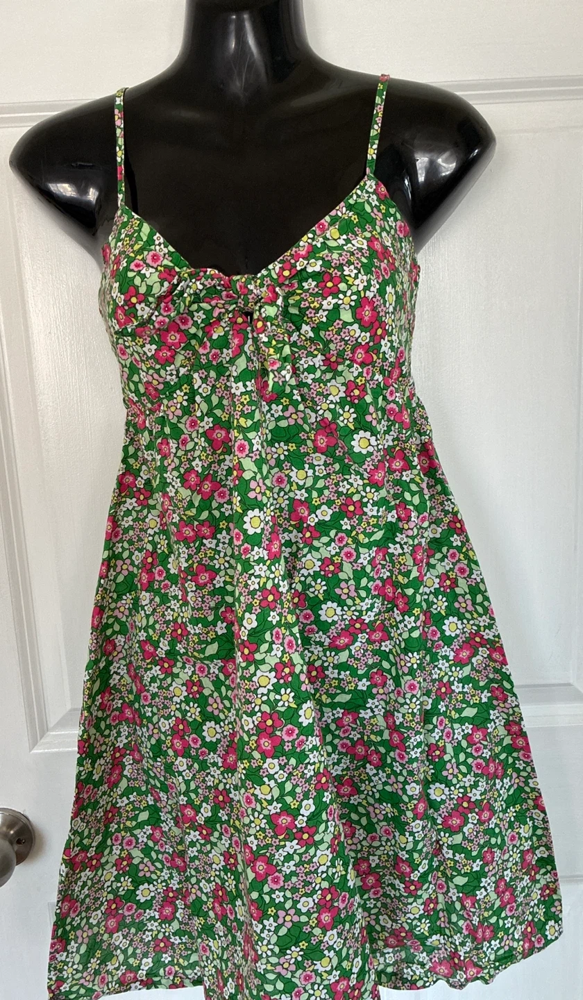 A cute green sundress with a colourful floral print and smocked back. It features adjustable spaghetti straps and a gathered bust with a tie detail. It's made of a lightweight fabric perfect for warmer days!