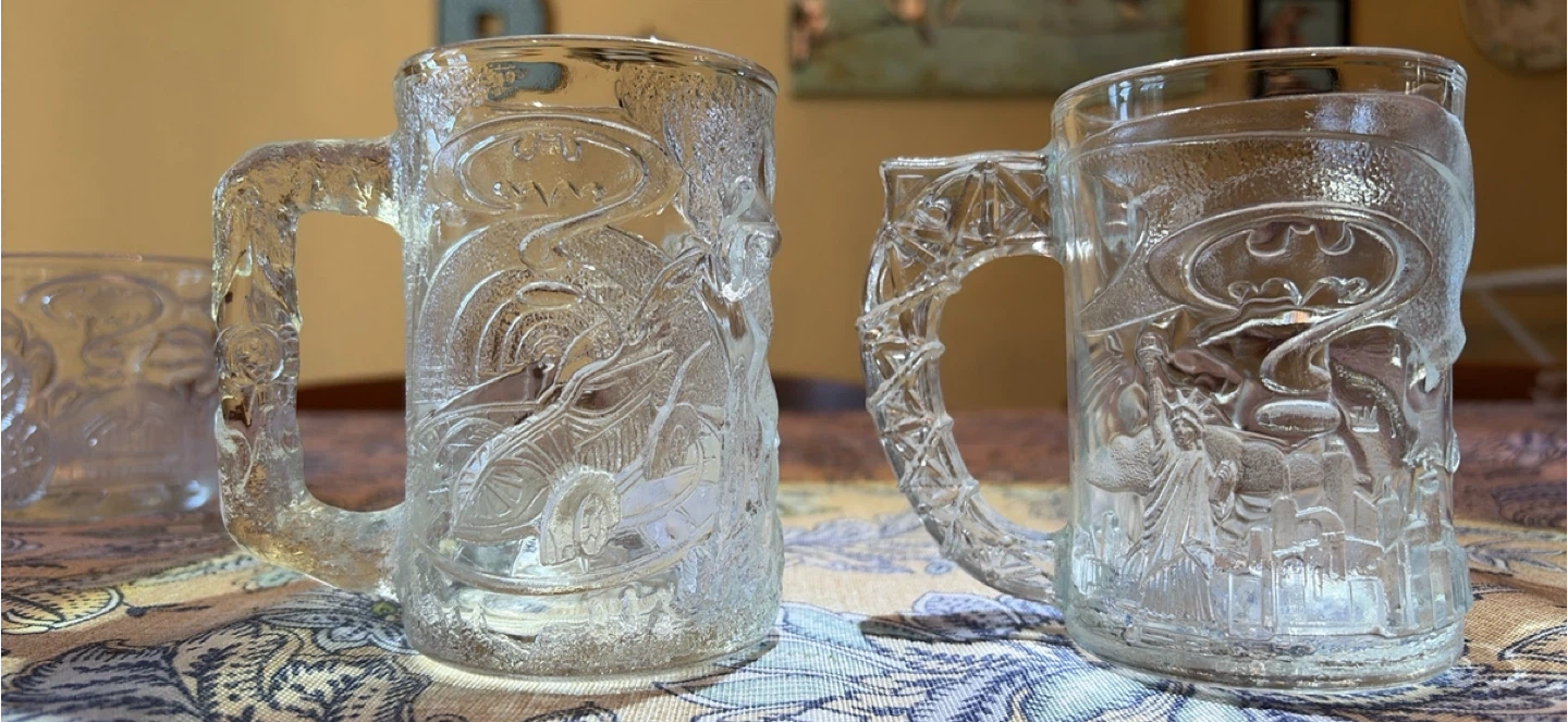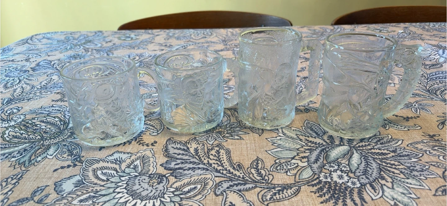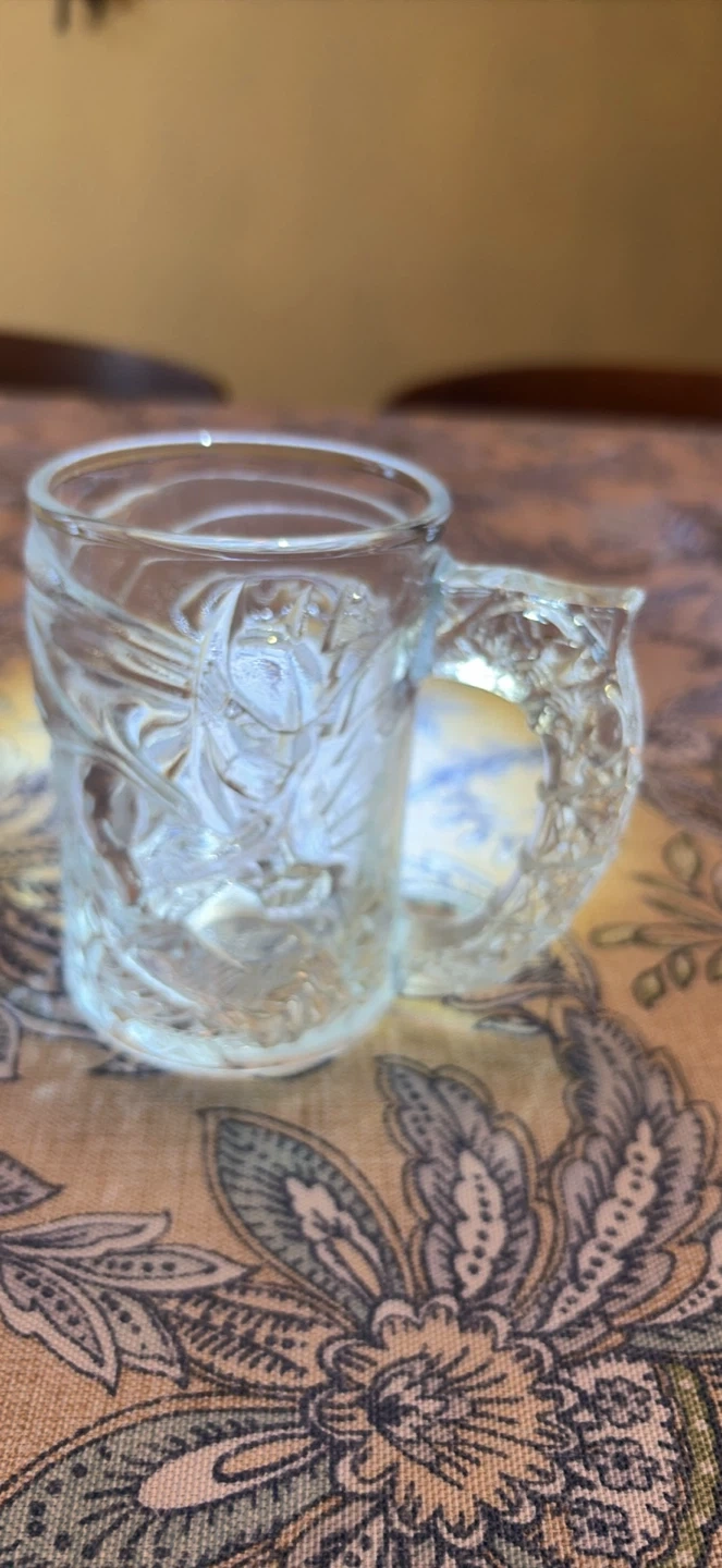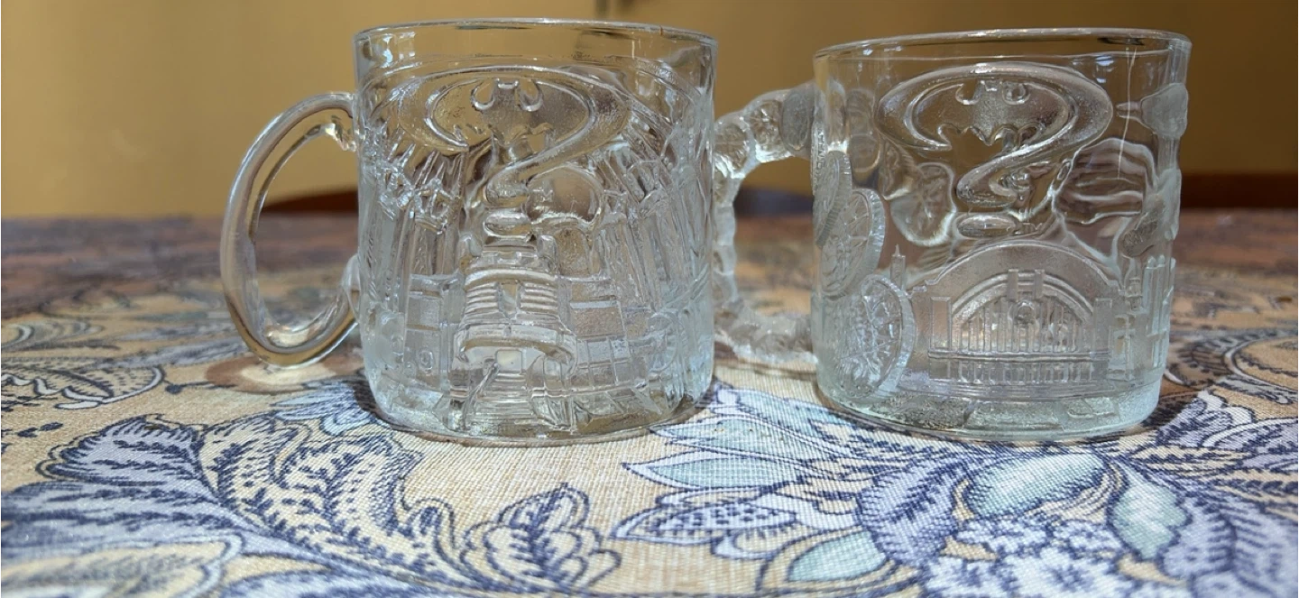 1995 Batman Forever embossed McDonalds collector glass mugs made in France. This set has all 4 characters (Batman, Robin, Riddler & Two Face) with no chips or cracks. A great collection with lots of detail. Please message if you are interested in more mugs. I have a total of 15 that I can sell for a group price.
