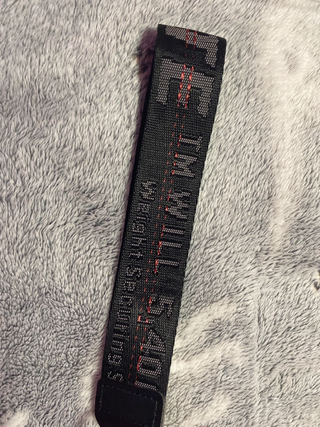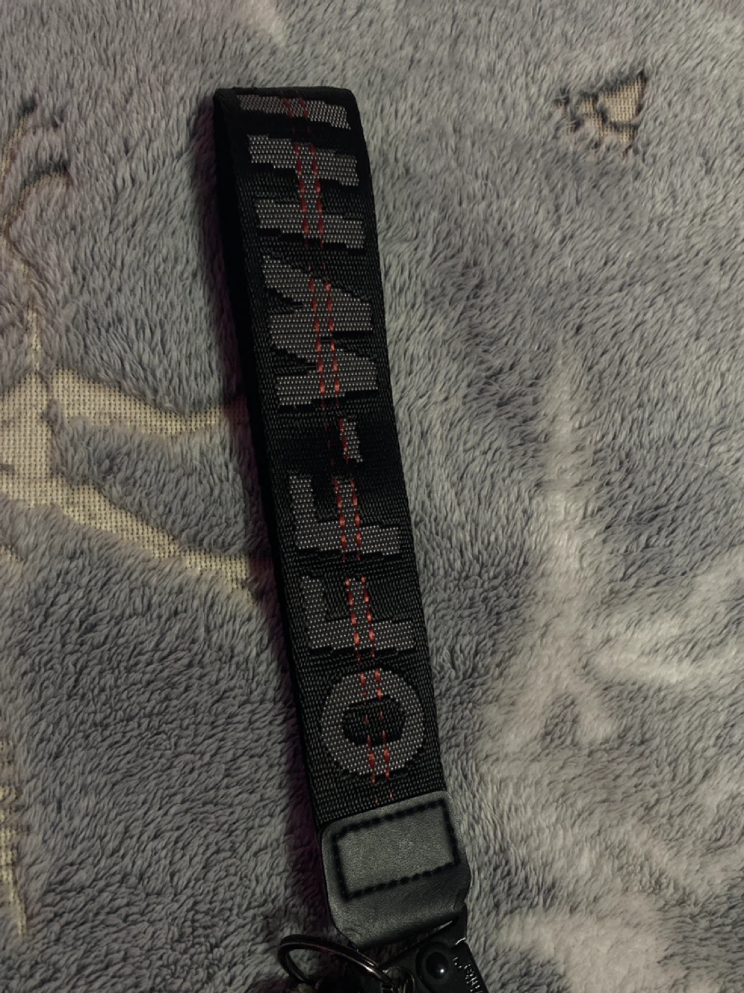 A black fabric keychain with red and grey "OFF-WHITE" text. It features a metal clasp and keyring. This accessory is great for keeping your keys secure and stylish!