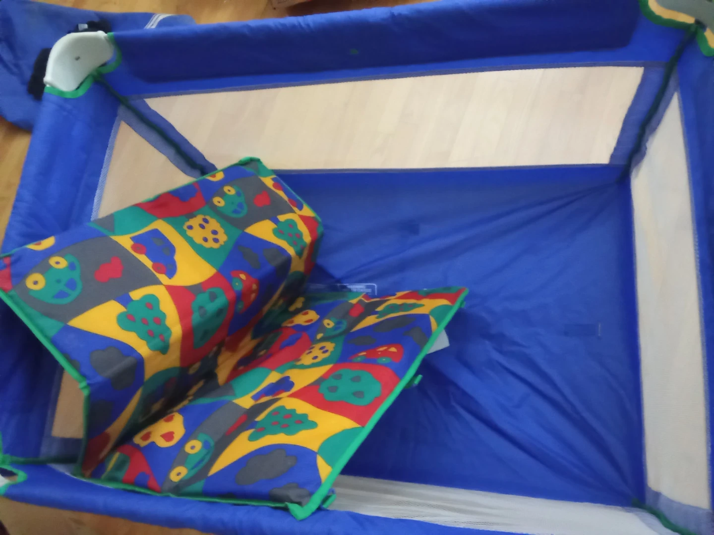 Blue Graco Pack 'n Play portable playard with a colourful patterned mattress. It has mesh sides for ventilation. This playard is great for travel or home use.