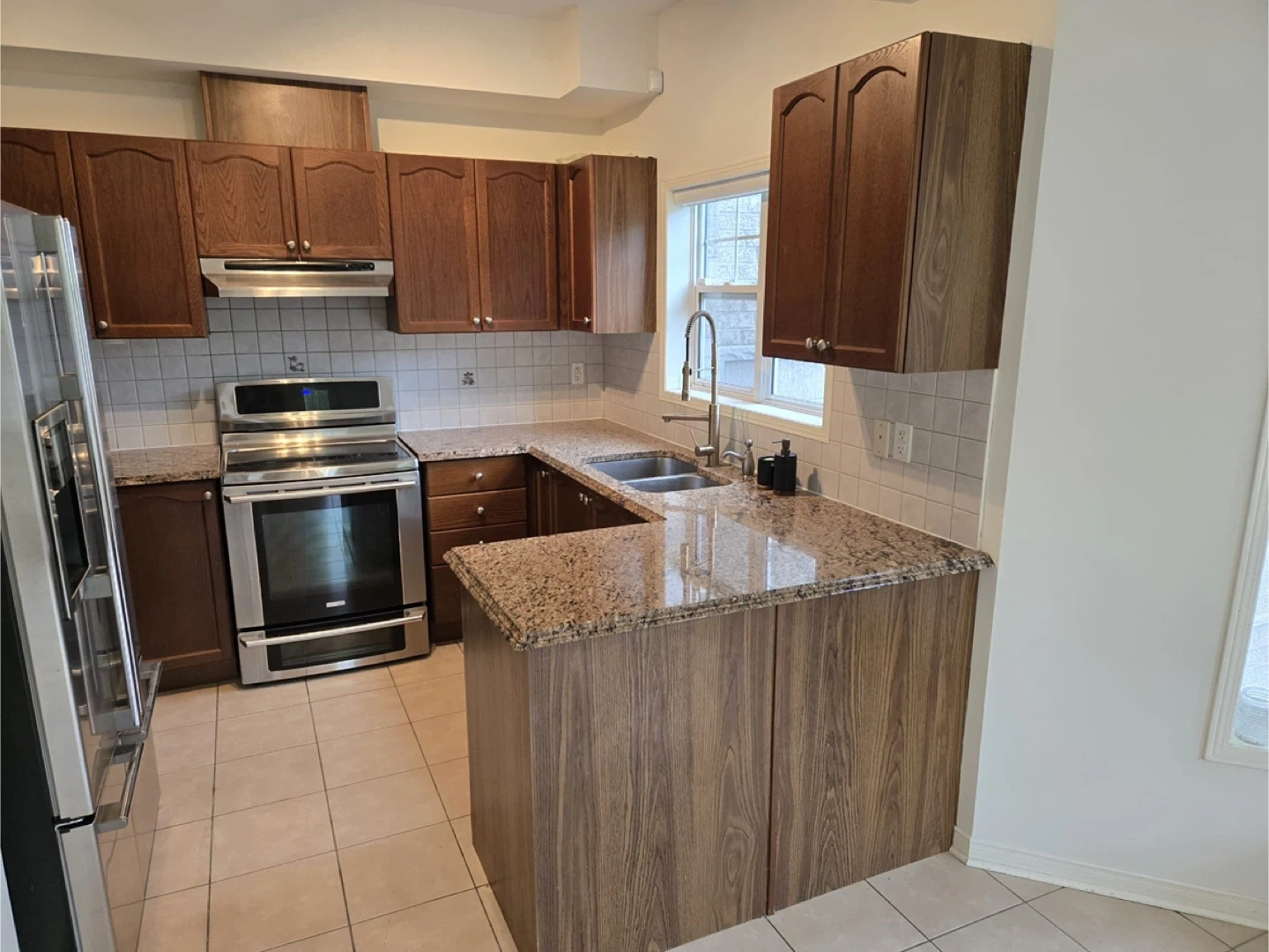 ✅ Granite Countertops – Polished finish with peninsula overhang (great for seating)