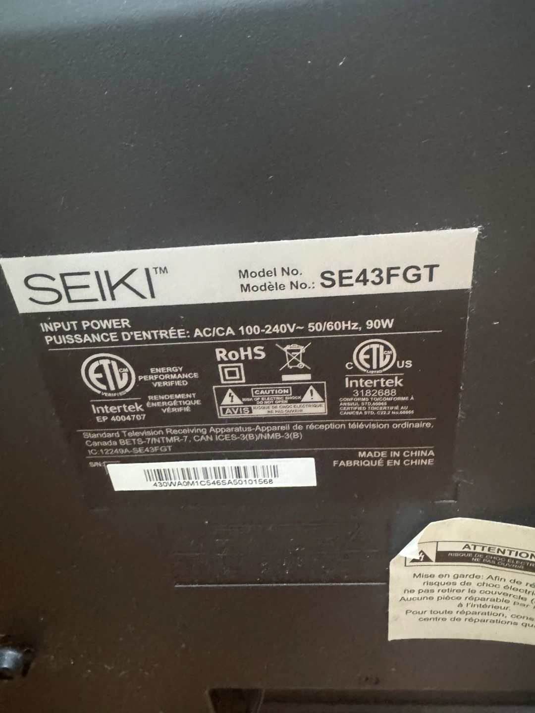 Selling a 43-inch Seiki Smart TV (Model SE43FGT) in excellent working condition.