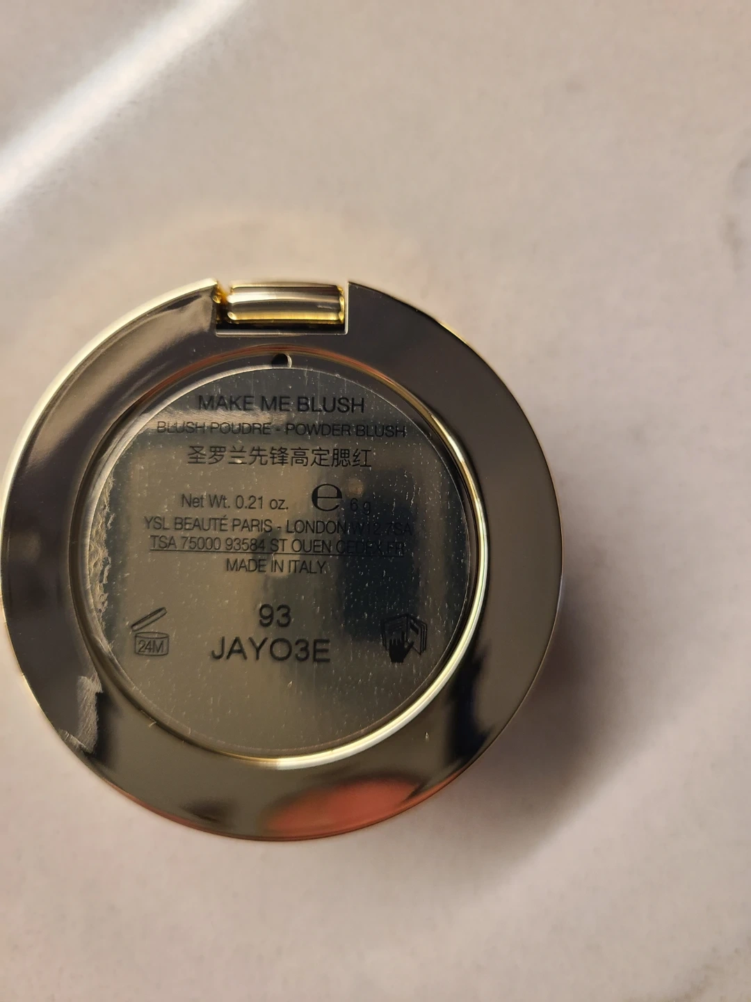 YSL "MAKE ME BLUSH" powder blush in shade 93. It's made in Italy and weighs 0.21 oz. The compact has a mirrored lid.