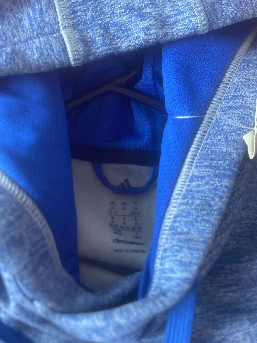 Selling an authentic brand new Adidas ClimaWarm hoodie in a nice blue color. It's a size M and features the Adidas logo. Perfect for staying warm during workouts or casual wear!