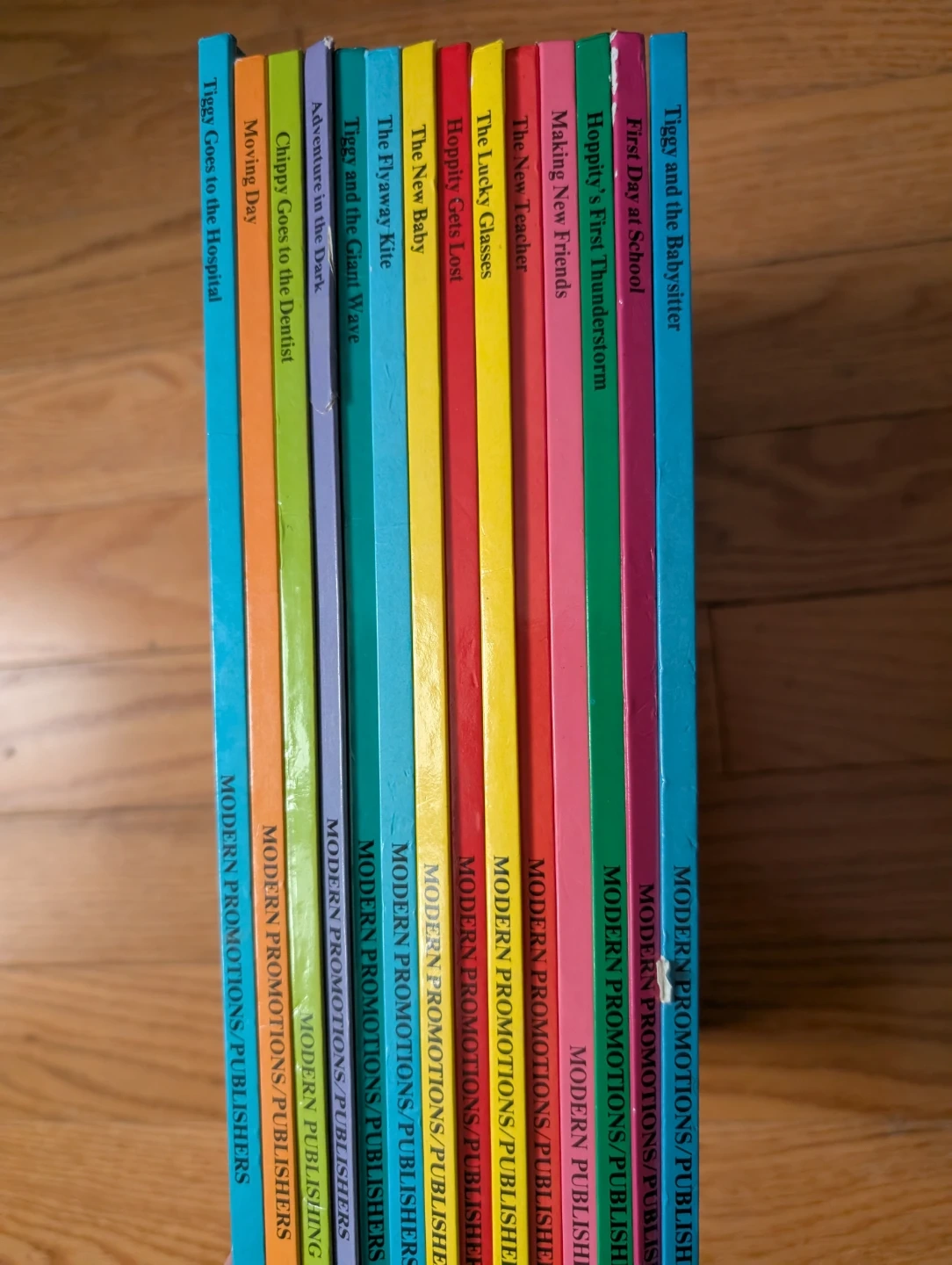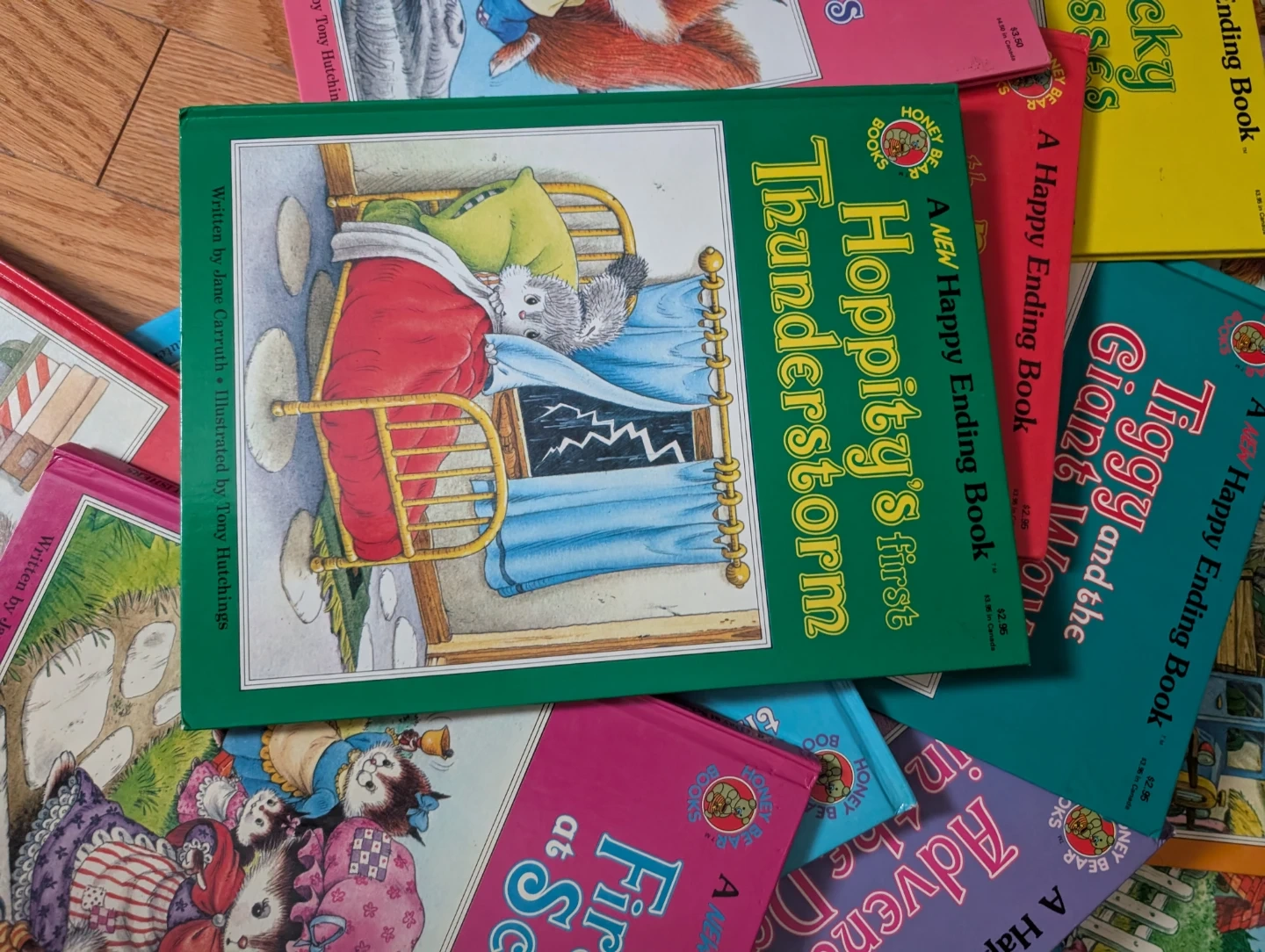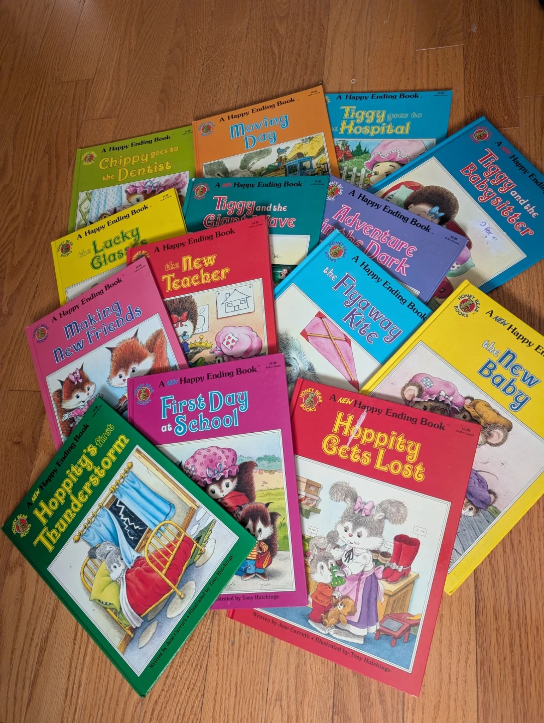 A collection of 14 Happy Ending Books, featuring titles like 'Hoppity's First Thunderstorm' and 'Tiggy Goes to Hospital'. These books are suitable for young readers. They're part of the Honey Bear Books series by Modern Promotions Publishers.