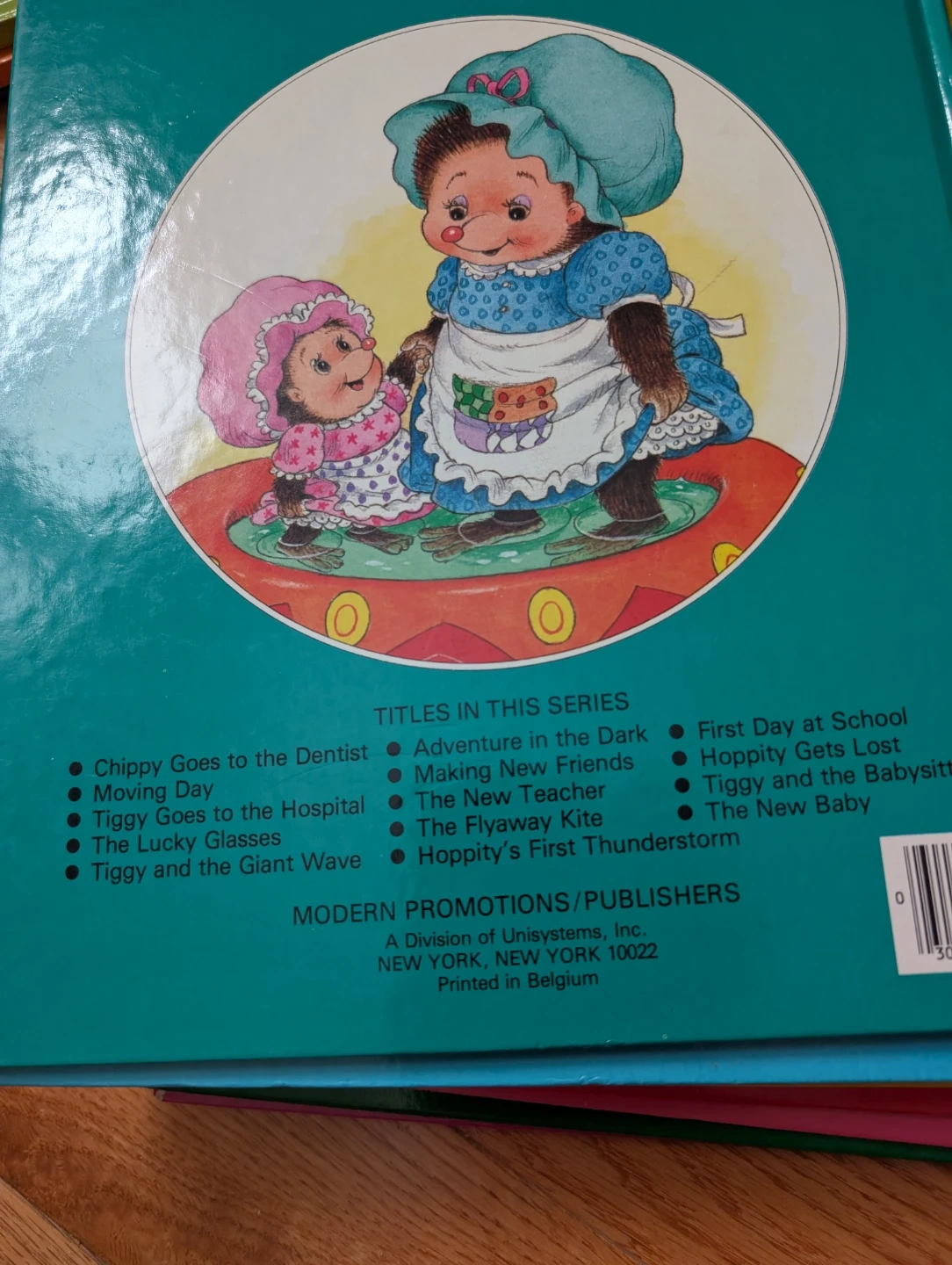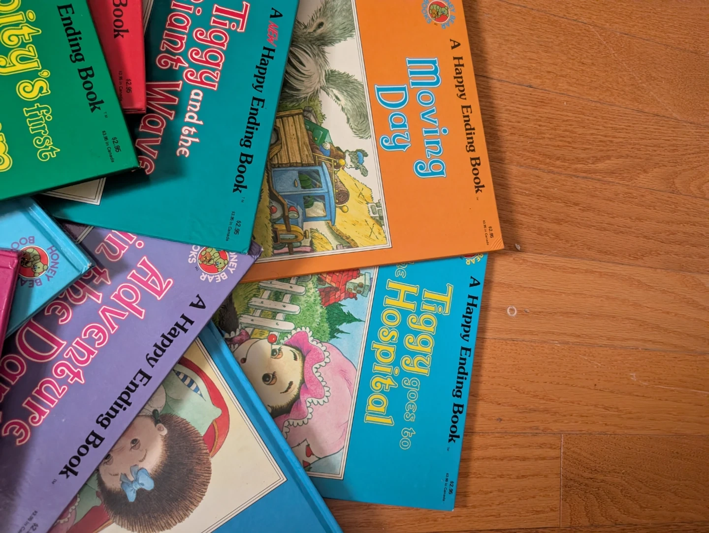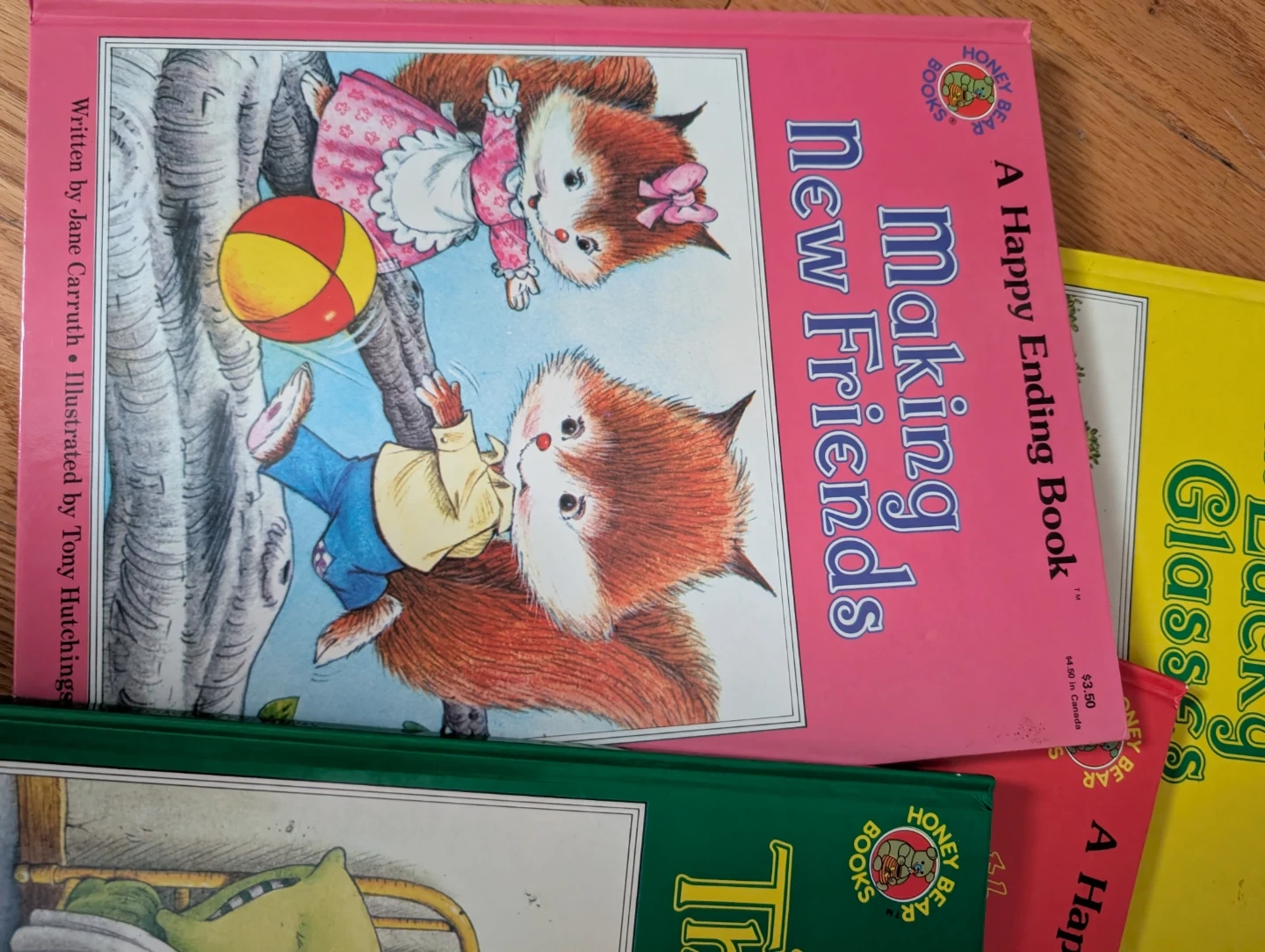 A collection of 14 Happy Ending Books, featuring titles like 'Hoppity's First Thunderstorm' and 'Tiggy Goes to Hospital'. These books are suitable for young readers. They're part of the Honey Bear Books series by Modern Promotions Publishers.
