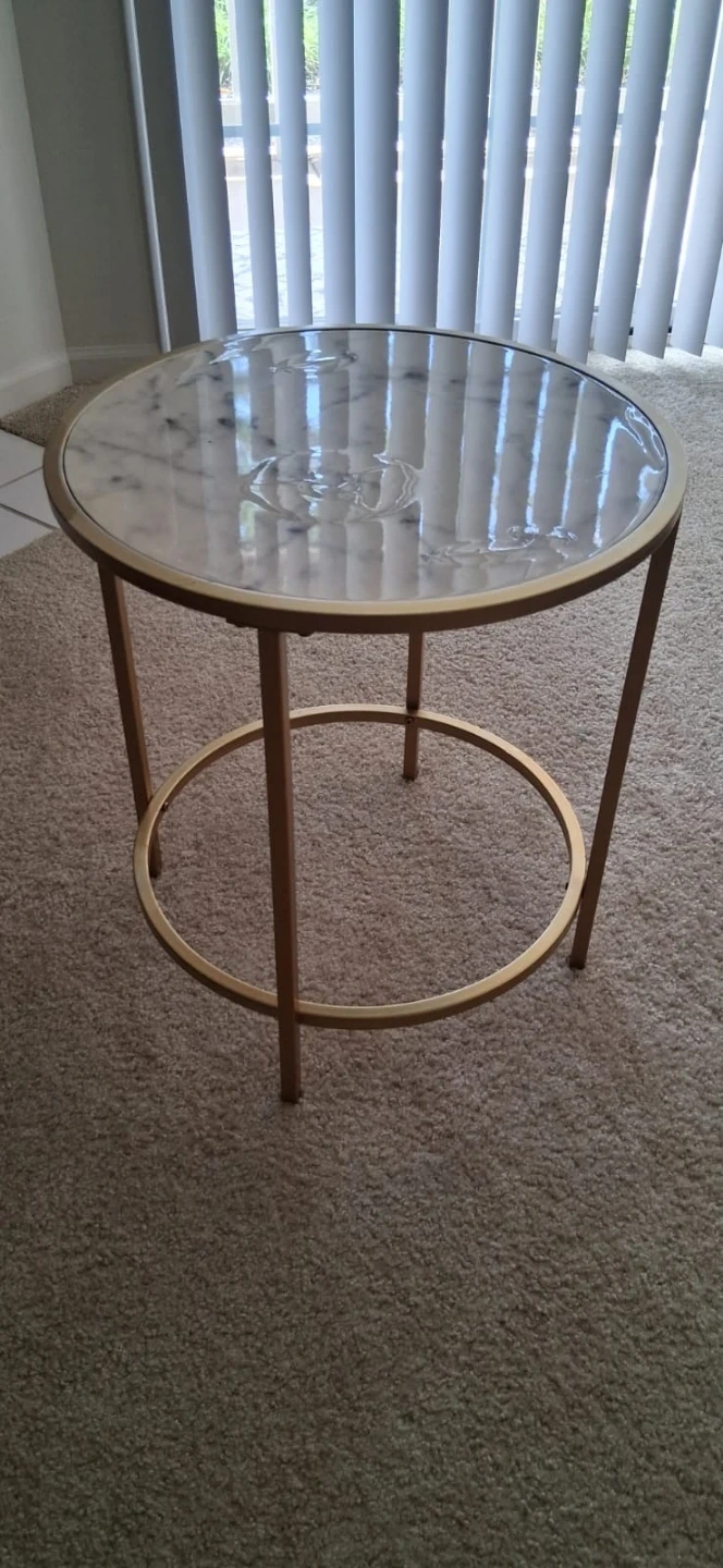 10Selling a stylish accent table with a faux marble top and a gold-finished frame. It's perfect for adding a touch of elegance to any room. The table features a unique design, combining a rectangular top with a decorative, curved base. It would look great next to a sofa or armchair!