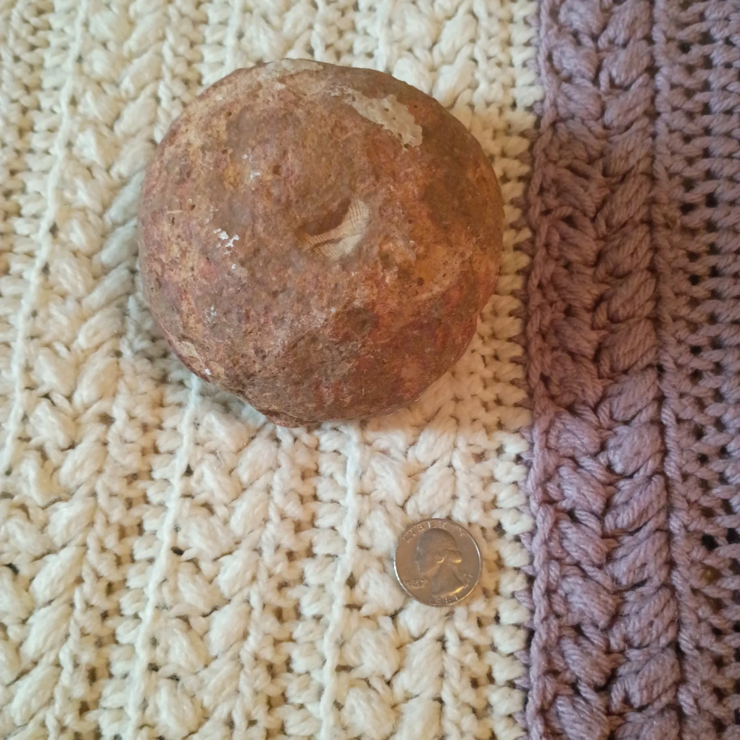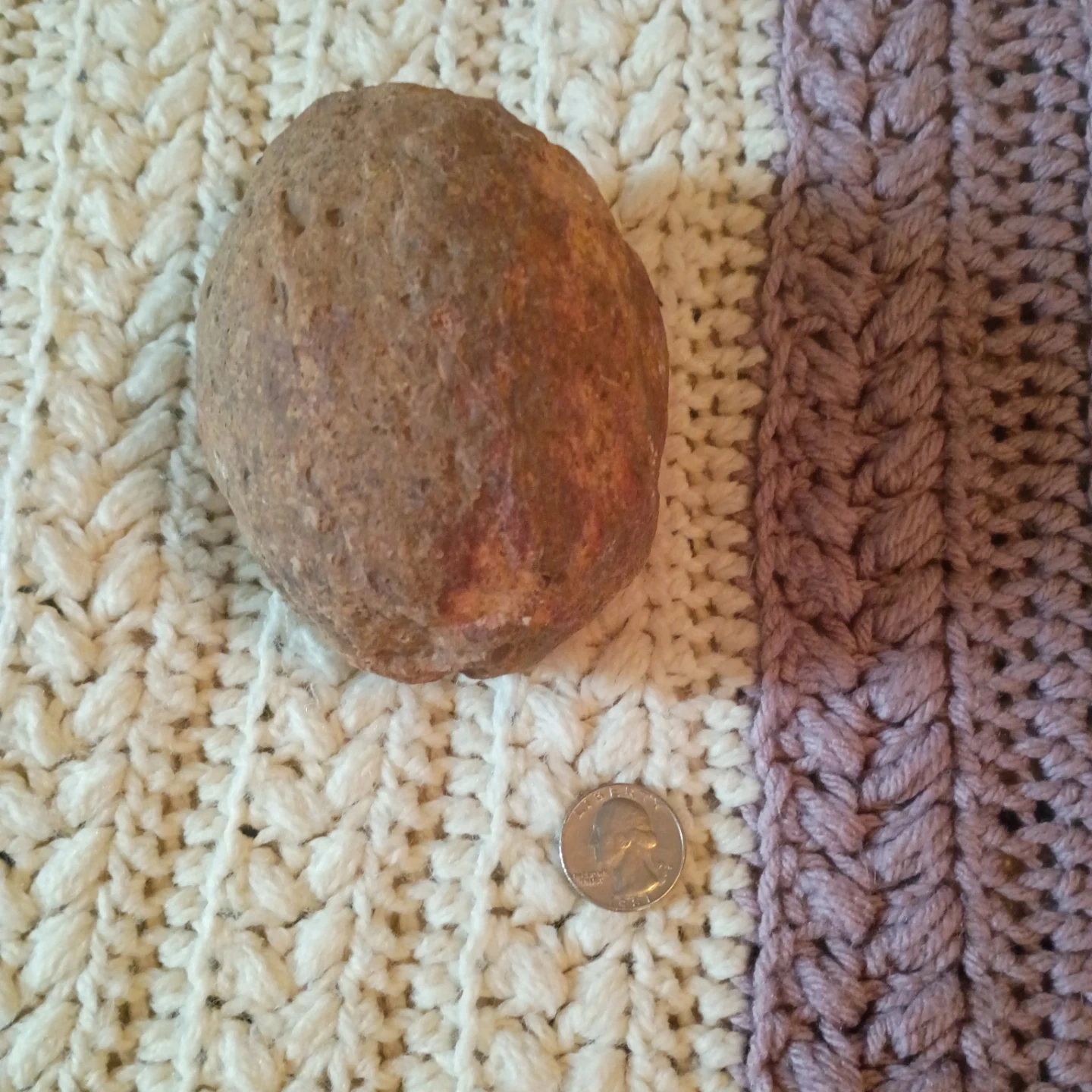 This is a decorative stone with a rough, natural texture. A quarter is shown for size comparison. It's a unique piece for display. Crack it open and see what crystal is inside!