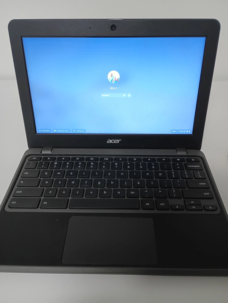 Black Acer Chromebook with a keyboard and a screen that displays a login screen. Great for browsing the web while relaxing on the couch.