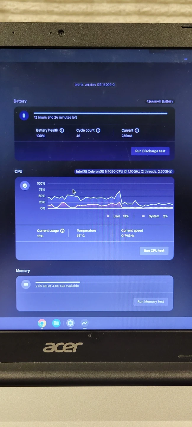 108Selling an Acer Chromebook in silver! It's in great condition and ready for a new home. It has 1.8GB available storage and a 4266mAh battery. The battery health is at 100% with a cycle count of 46. Perfect for school, work, or just browsing the web