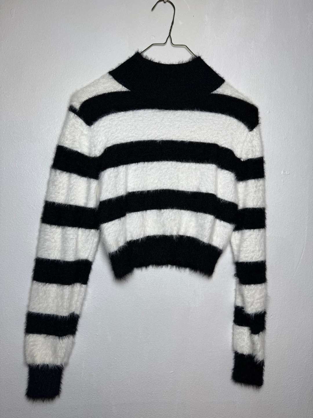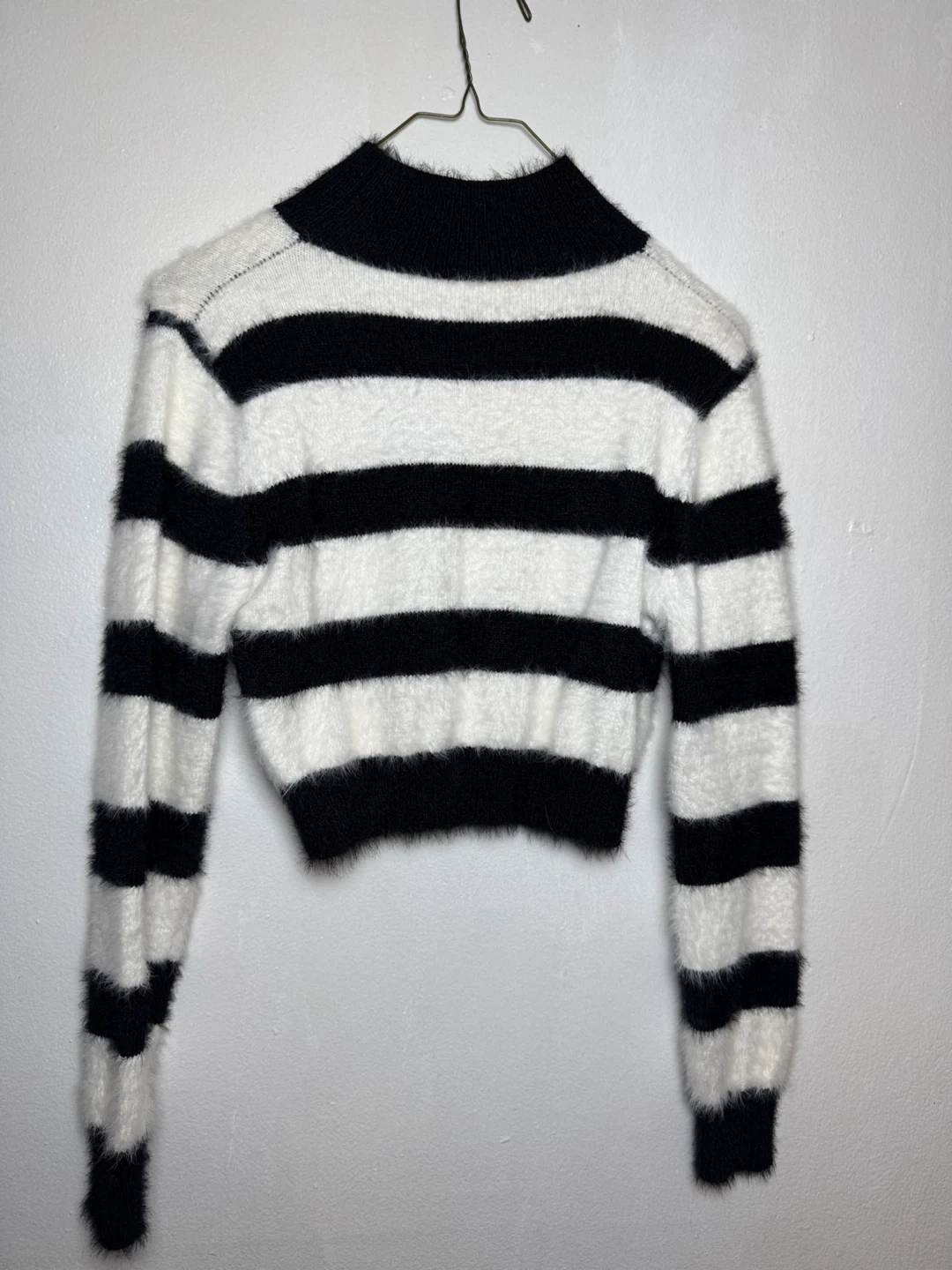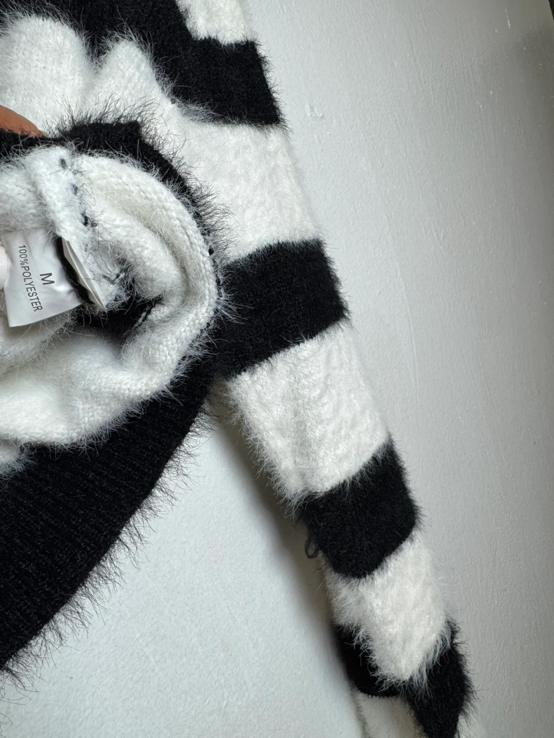 This fuzzy sweater has a black and white stripe pattern. It's a size medium and made of 100% polyester. The fuzzy material makes it cozy!