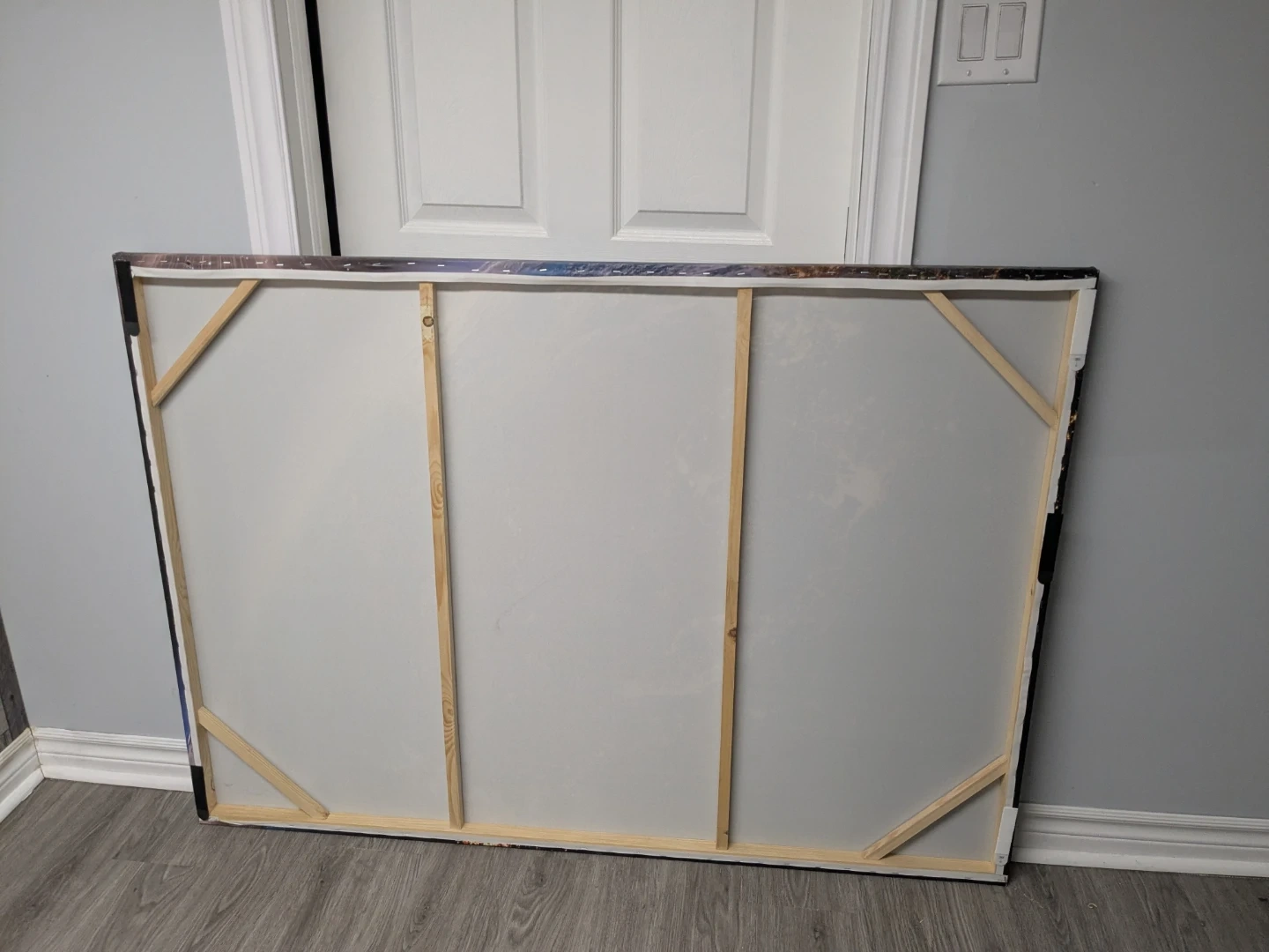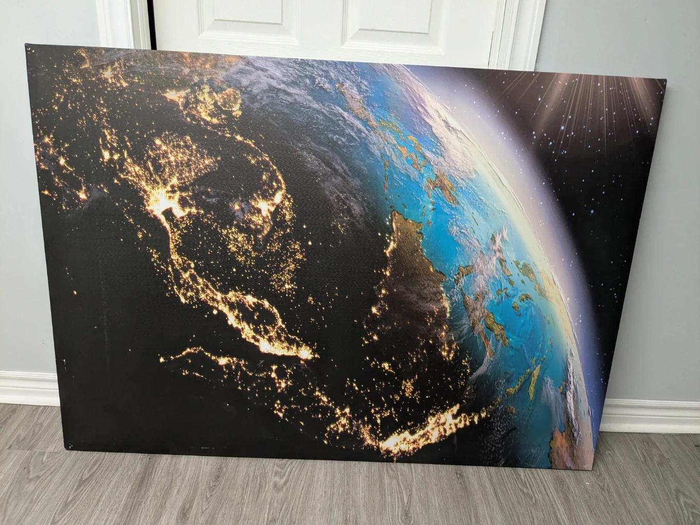 This large canvas art depicts the Earth from space, with city lights visible on the night side. It's stretched over a wooden frame. It's a beautiful piece for any room! 55 inches wide, 39.5 inches tall, 1.5 inches deep. Like new. Asking $35 or best offer. Can deliver anywhere in Hamilton for extra $5.