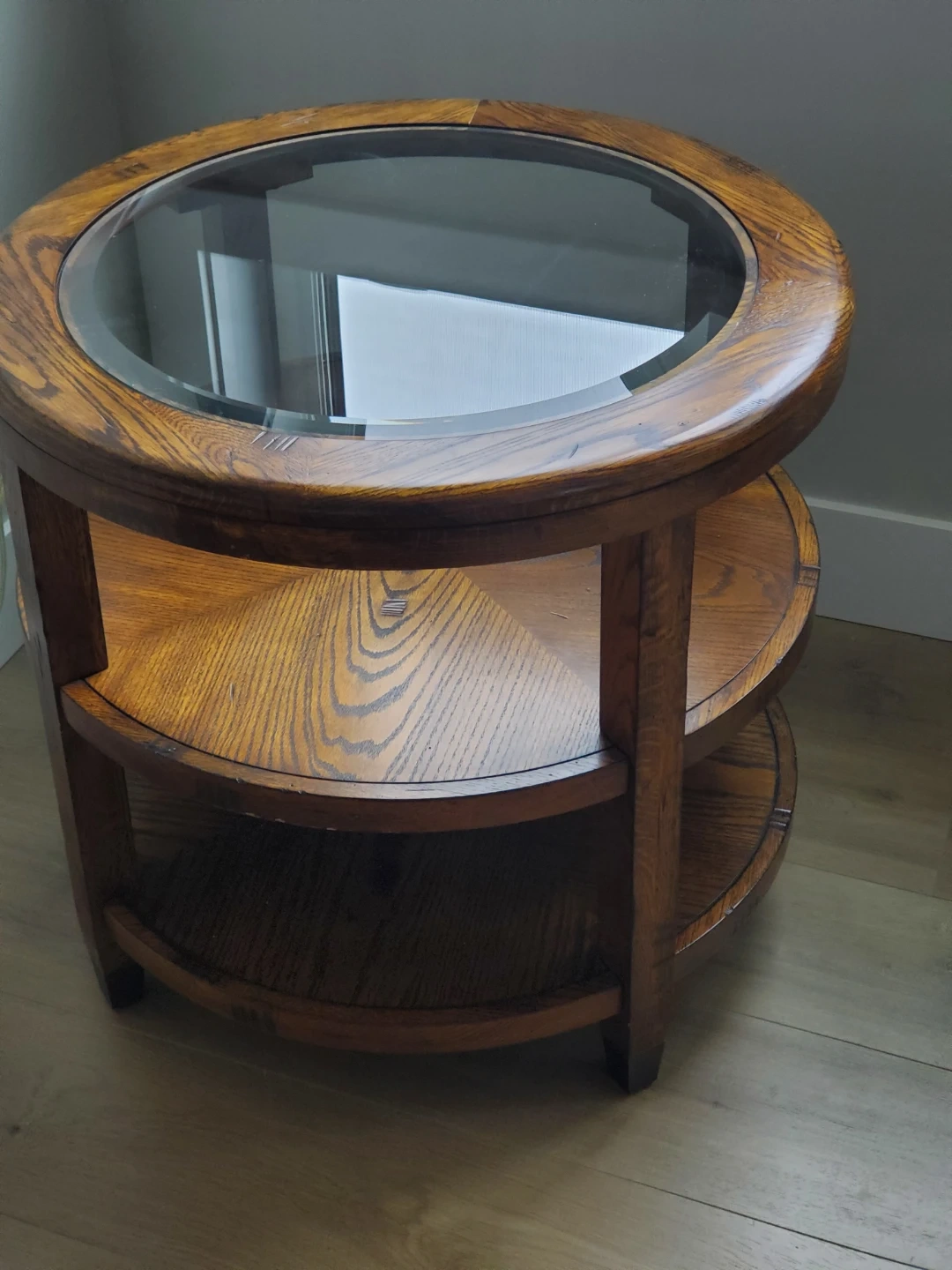 These are quality round side tables made from solid oak with a clear glass top. It features two lower shelves for storage and display. Wood finish is a warm, medium brown.