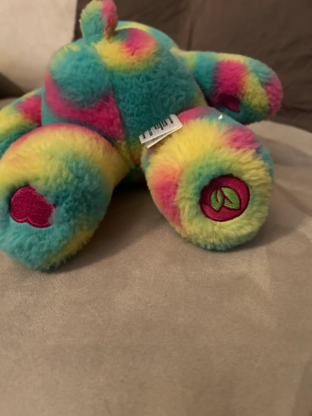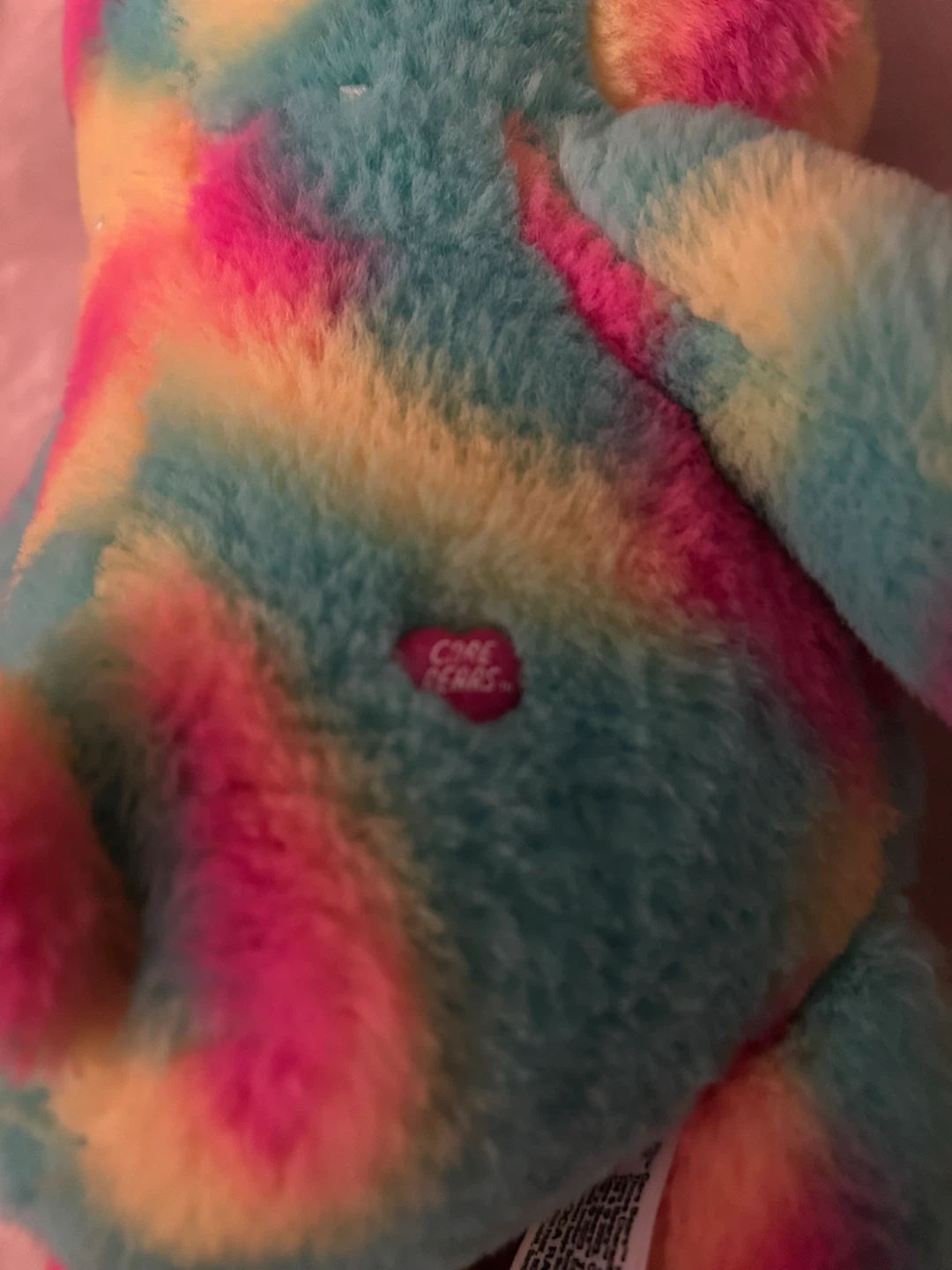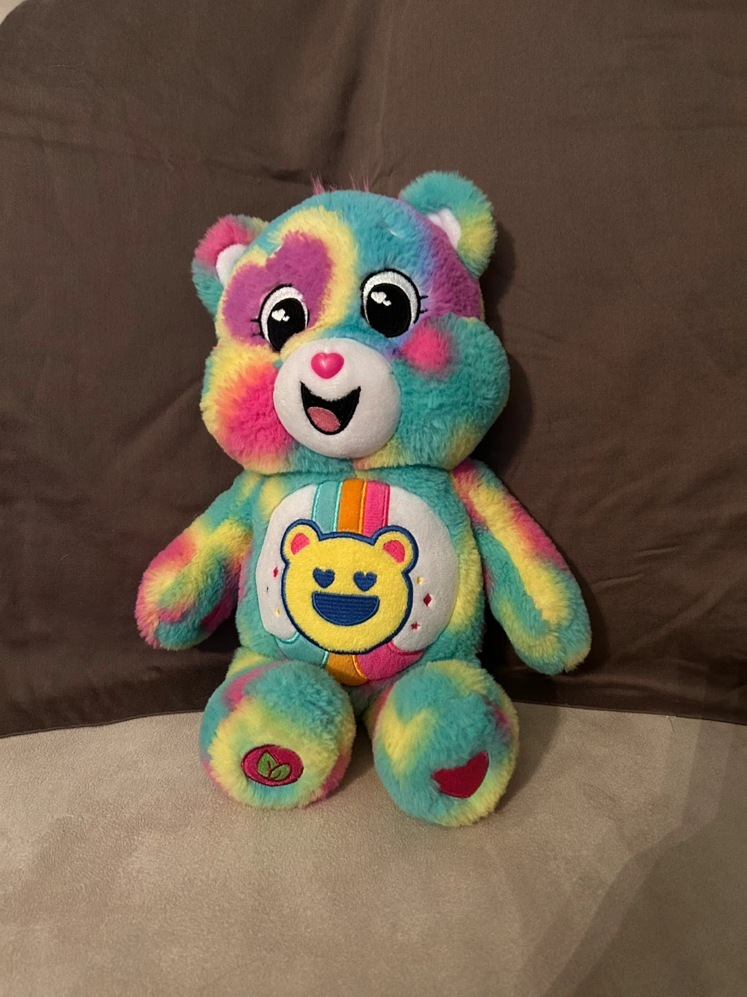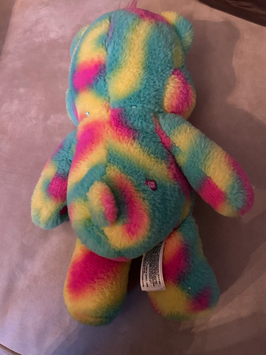 This is a Care Bears plush toy with a vibrant tie-dye pattern. It's soft and cuddly. The bear features a heart belly badge.14”