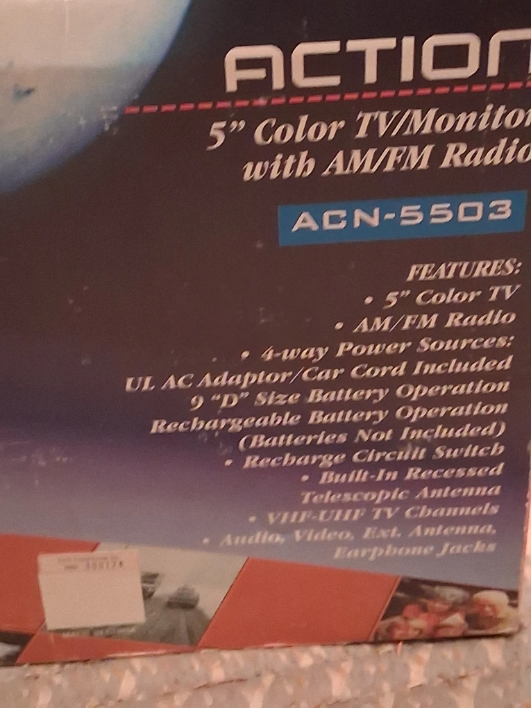 Selling an ACTION 5" Color TV/Monitor with AM/FM Radio, model ACN-5503. Features include: - 5" Color TV - AM/FM Radio - 4-way Power Sources: UL AC Adaptor/Car Cord Included - 9 "D" Size Battery Operation - Rechargeable Battery Operation (Batteries Not Included) - Recharge Circuit Switch - Built-In Recessed Telescopic Antenna - VHF-UHF TV Channels - Audio, Video, Ext. Antenna, Earphone Jacks Cash Only located in Fair Lawn NJ 07410 Available while post is online. All sales are final once purchased! Thank you!