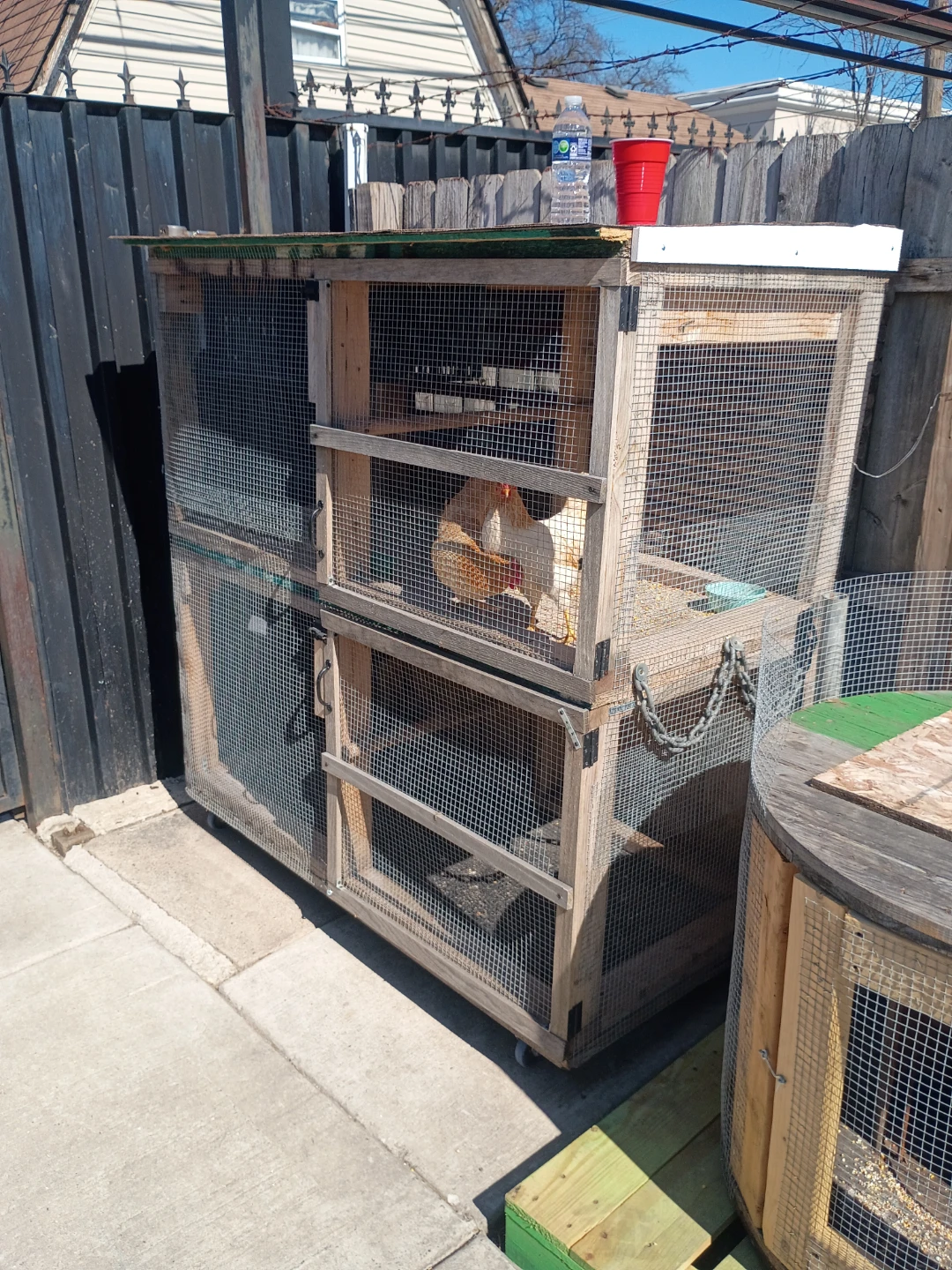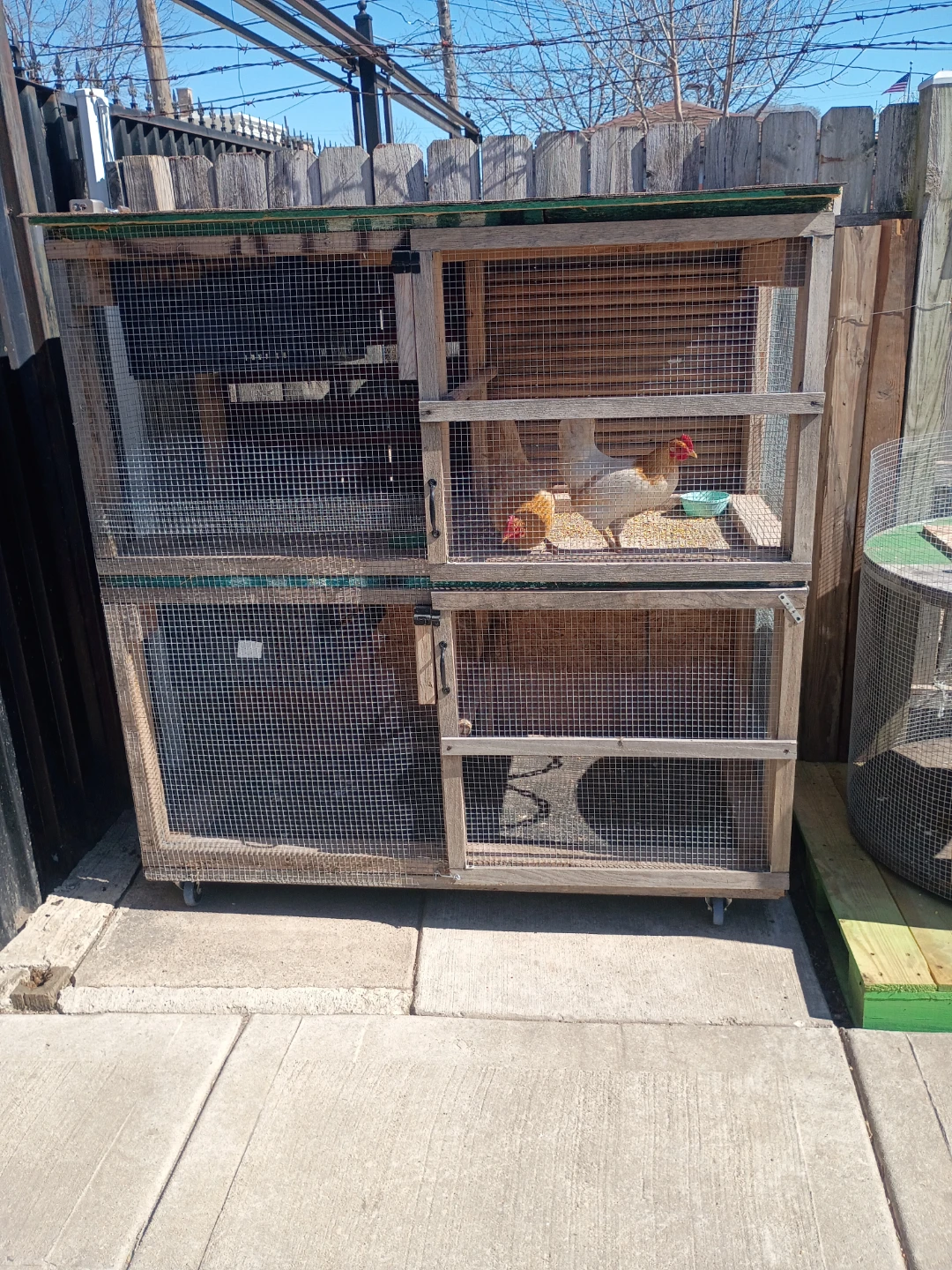 This is a sturdy, multi-level chicken coop and run system. It features wooden construction with wire mesh for ventilation and security. Perfect for keeping your flock safe and comfortable outdoors! Also make custom houses for any kind of pets dm me for your ideas and will make them into reality