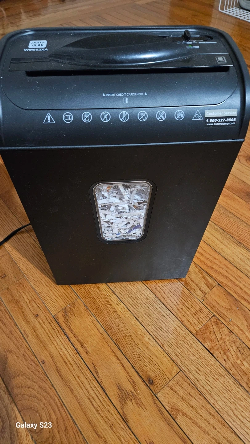 Selling a Pen+Gear WM682XA paper shredder! It has a jam remover and also can shred credit cards. It also has a 6 minute run time. 6x11 inches.