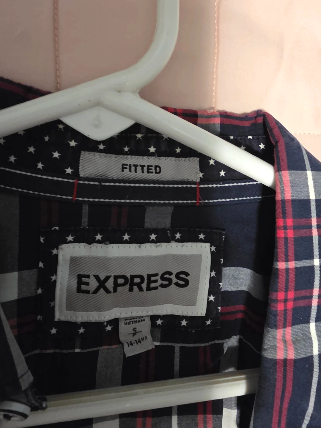 Express long-sleeve button-up shirt in a navy, red, and white plaid pattern. It's a fitted style. 100% cotton material.