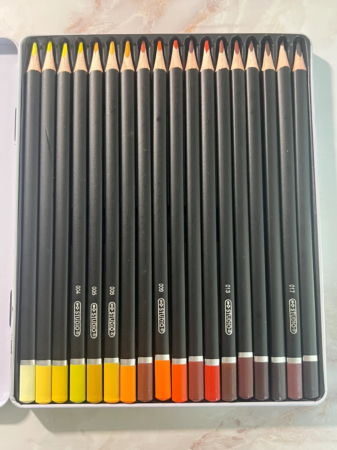 Here's a set of Studio 18 Coloured Pencils! They come in a tin box. These pencils feature an ergonomic, triangular design for a comfortable grip. Perfect for artists of all levels!