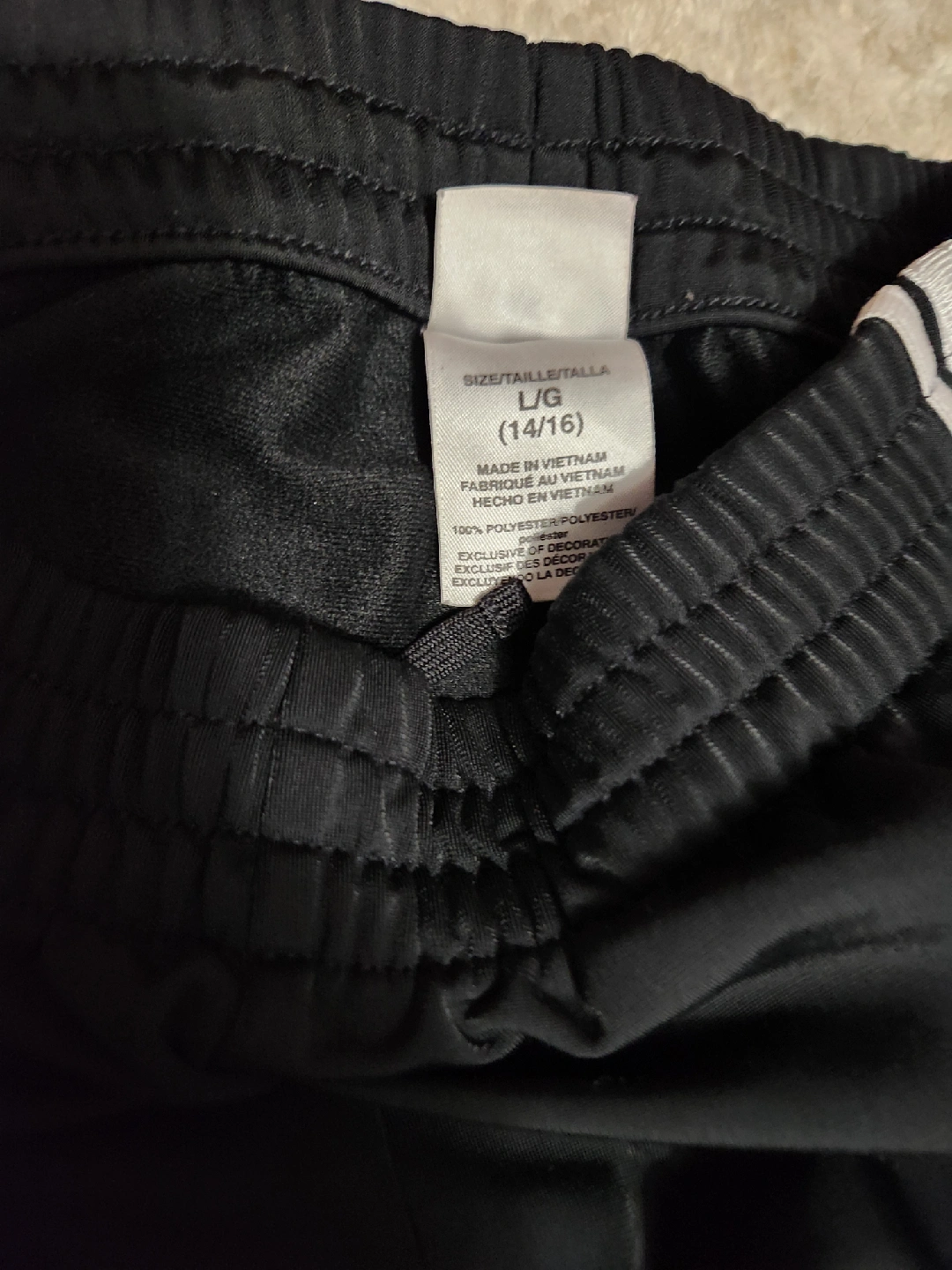 10Selling a pair of Adidas black track pants in size L/G (14/16). They feature the classic three stripe design. Made of 100% polyester.