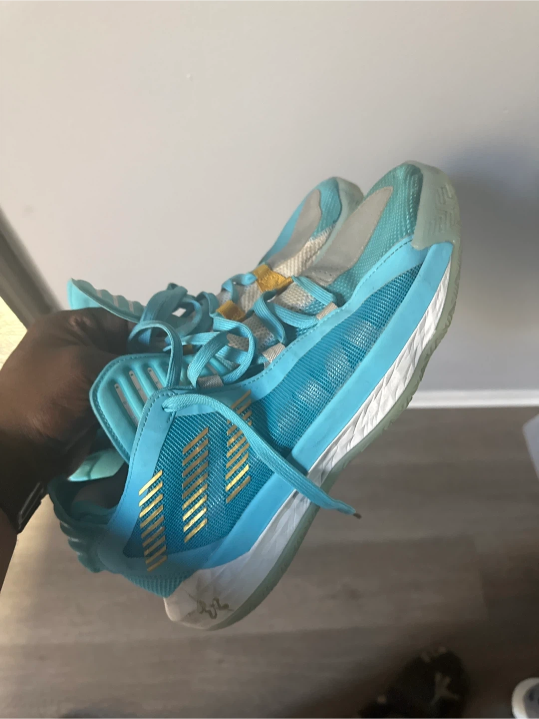 15Selling a pair of Adidas Dame 6 basketball shoes in a light blue colorway. They're in good condition with some signs of wear on the soles. Size is US 11. Great for playing ball or casual wear!