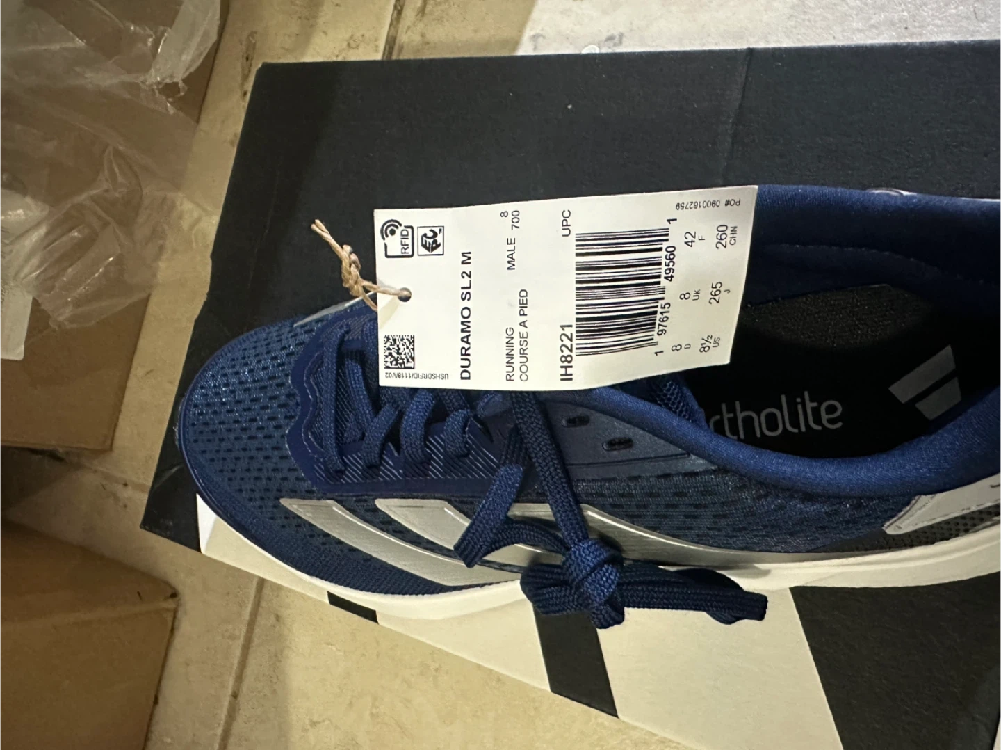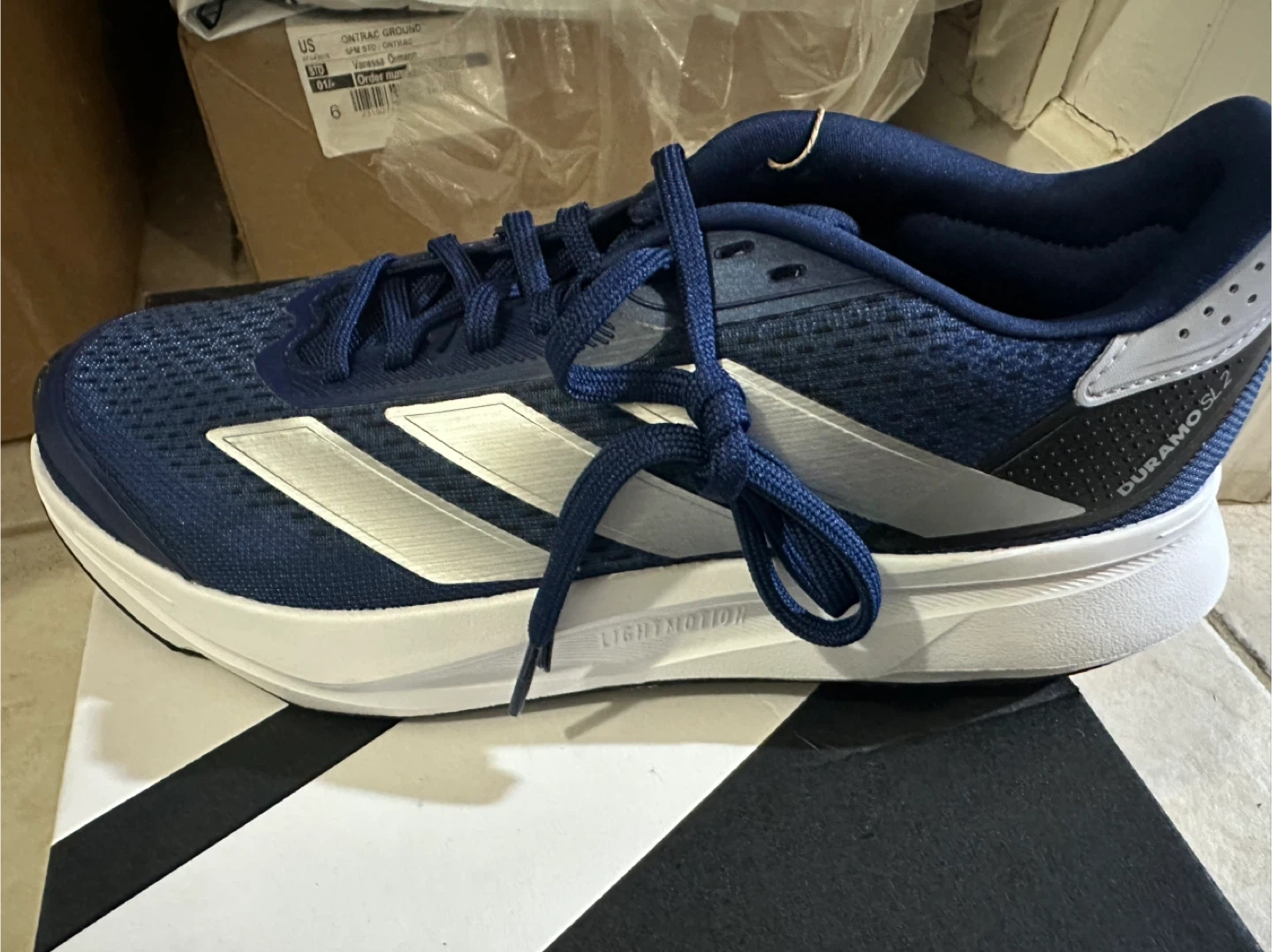 10Selling a pair of Adidas Duramo SL2 M running shoes in size 8.5. They are a stylish navy blue with silver accents and feature a comfortable Ortholite insole. The shoes also have Lightmotion technology for added support and cushioning. The box is included!