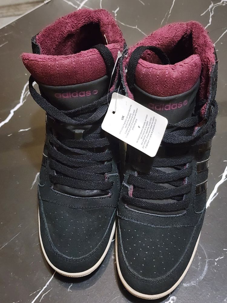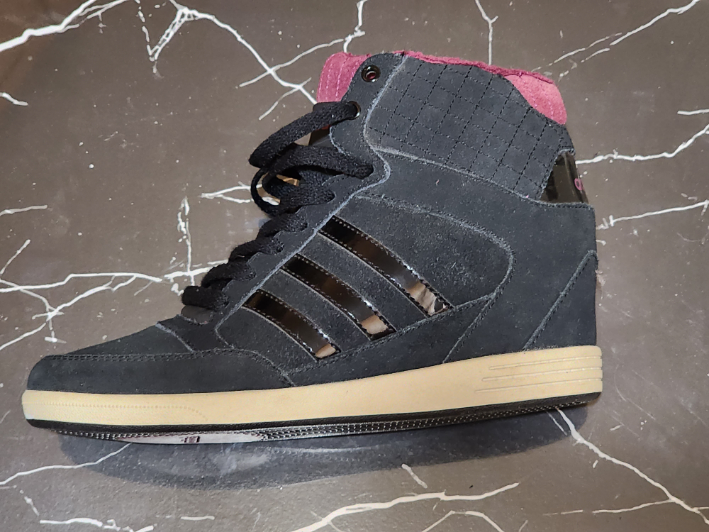 Adidas Neo - Hidden Wedge Heel, Women's size 9 1/2, lace up, black suede sneakers, beige around the bottom. Warm and cozy. Great for a girls' night out, date night, or to simply look stylish when your taking pics for your social media page.