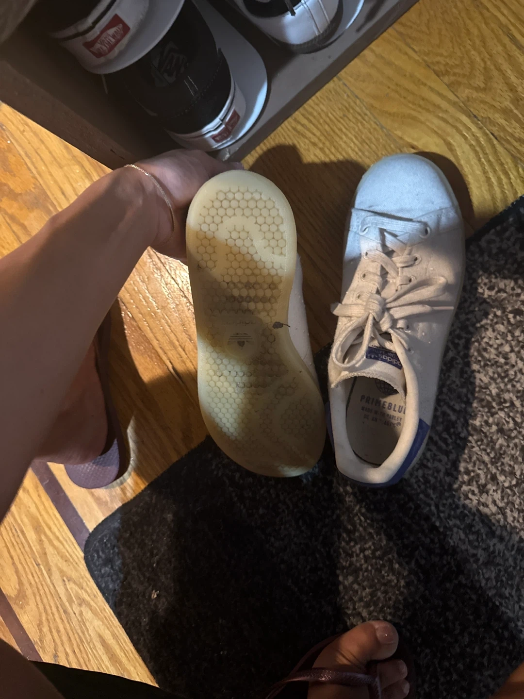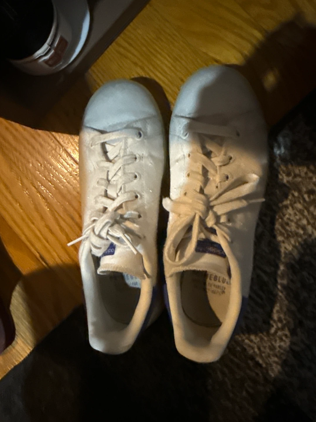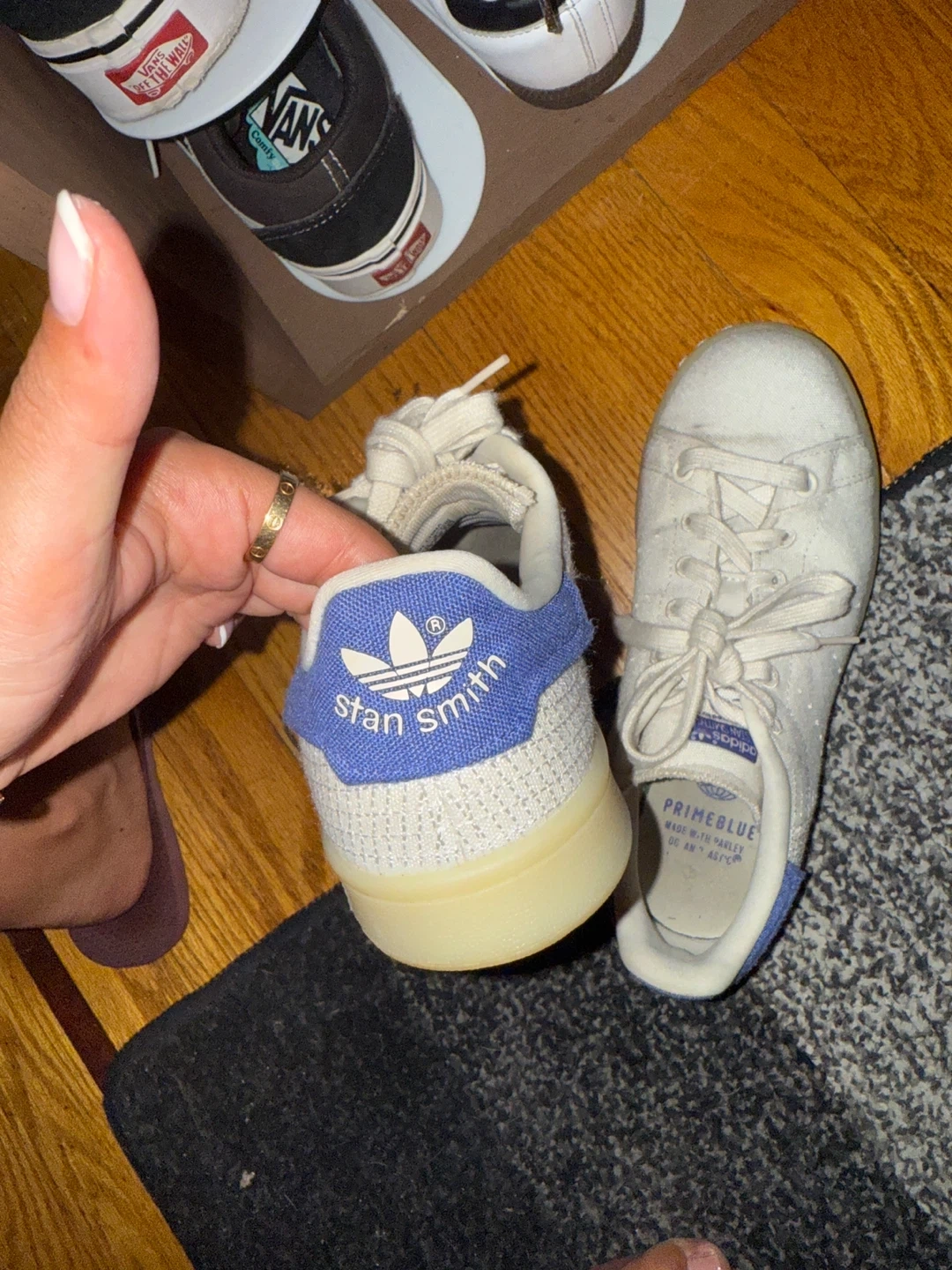 Selling a pair of Adidas Stan Smith women shoes. They have a white and blue color scheme. Good condition. Size 5