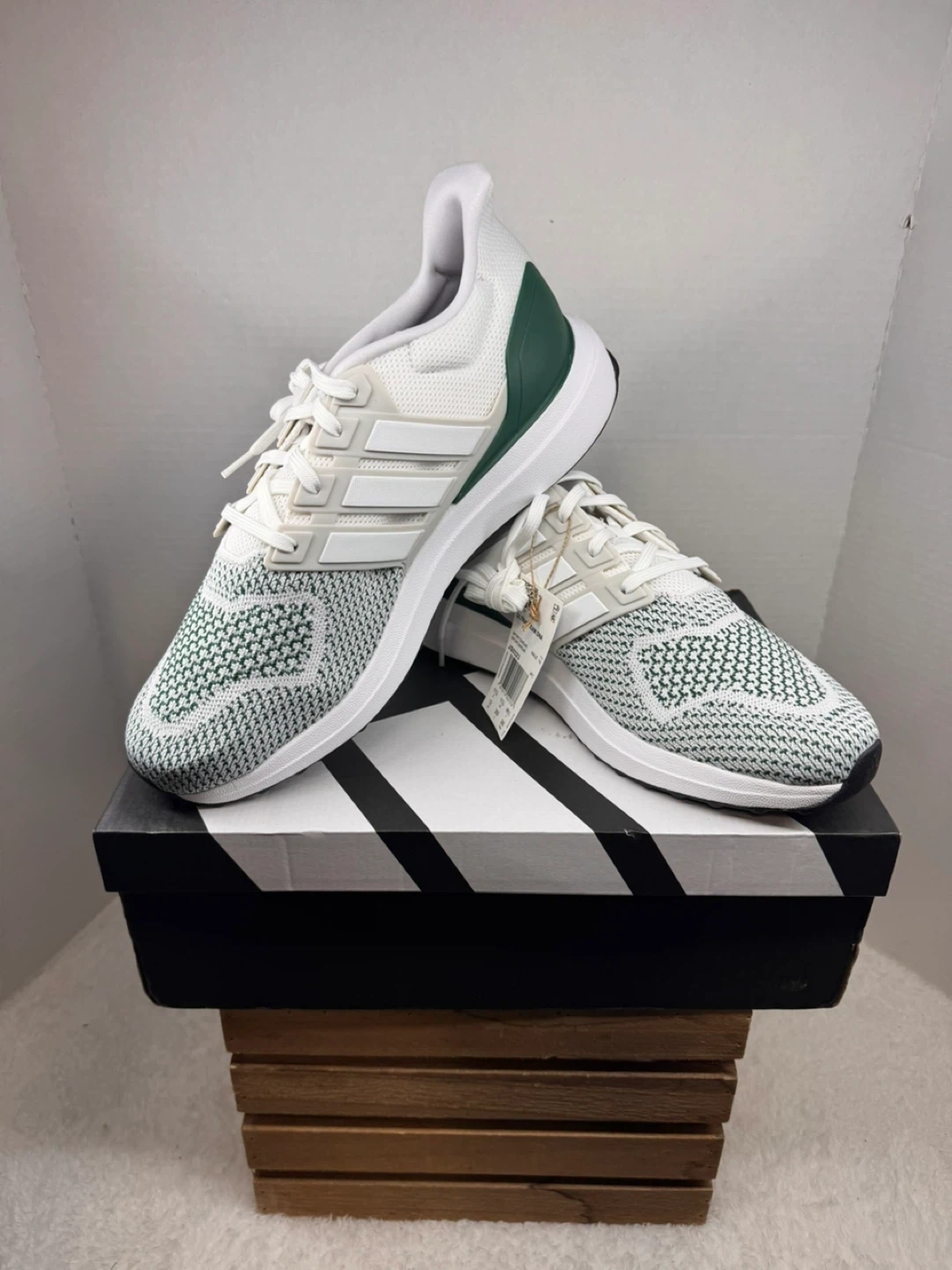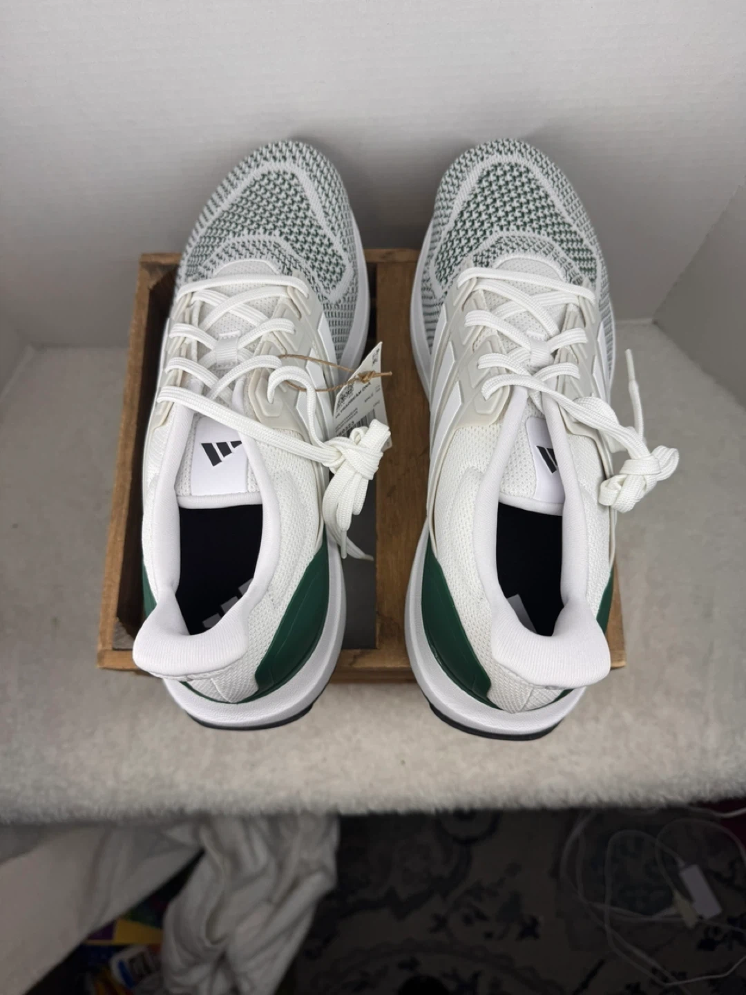 These Adidas Ultraboost DNA 5.0 running shoes are in new condition and come with the original box! The shoes feature a white and green color scheme. Perfect for running or everyday wear