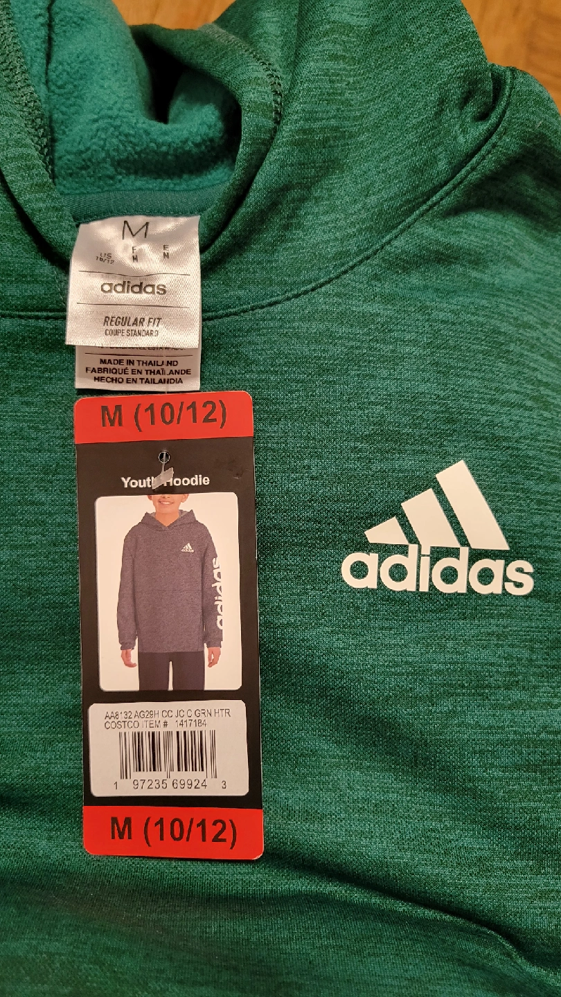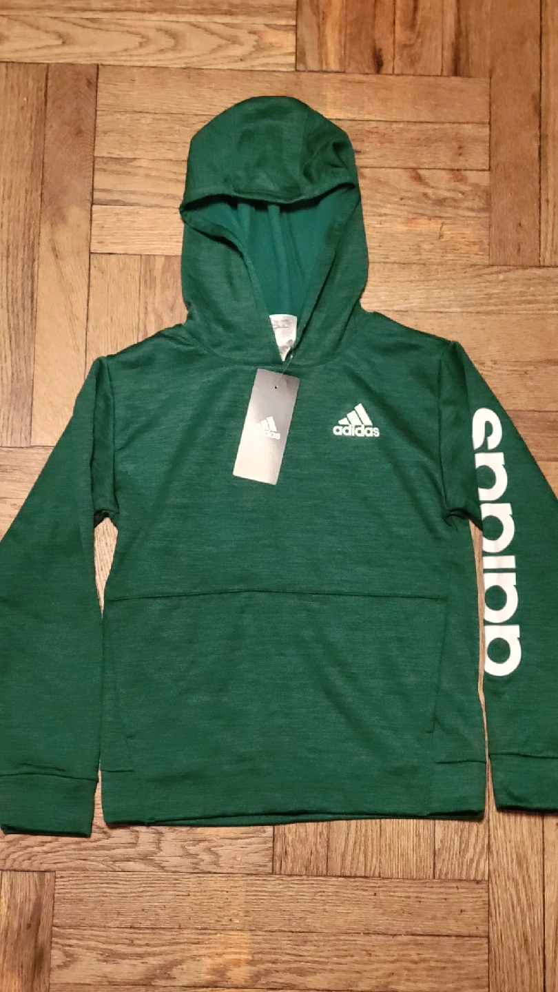 Selling an Adidas youth hoodie in size M (10/12). It's a regular fit and features the Adidas logo on the front and sleeve. The color is a nice green heather. Perfect for keeping warm!