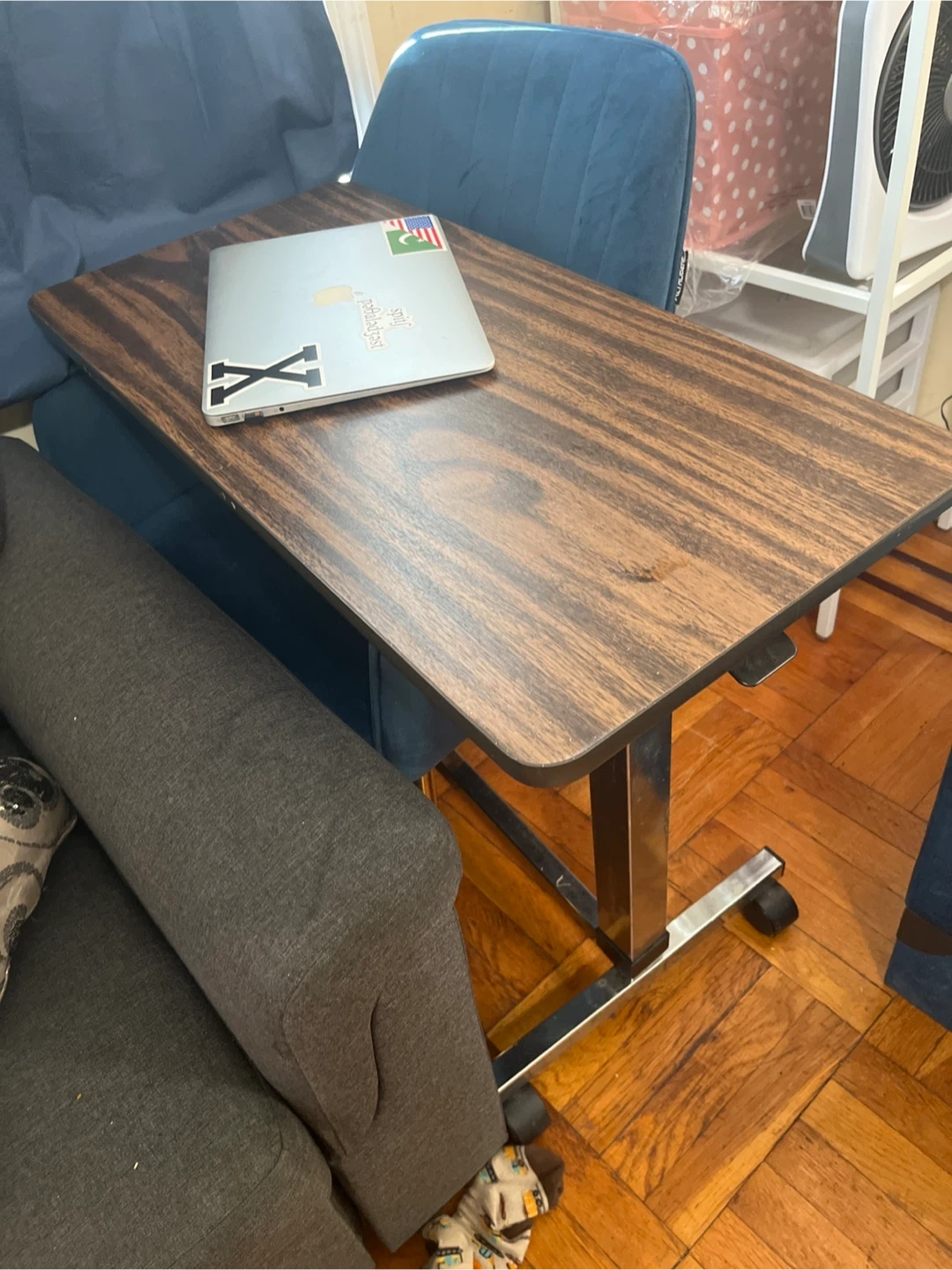 122Selling an adjustable laptop desk table with a comfortable chair! The desk features a wood-grain finish and a sturdy metal frame with wheels for easy movement. The chair has a blue velvet-like upholstery and chrome legs. It's perfect for working from home or studying in comfort