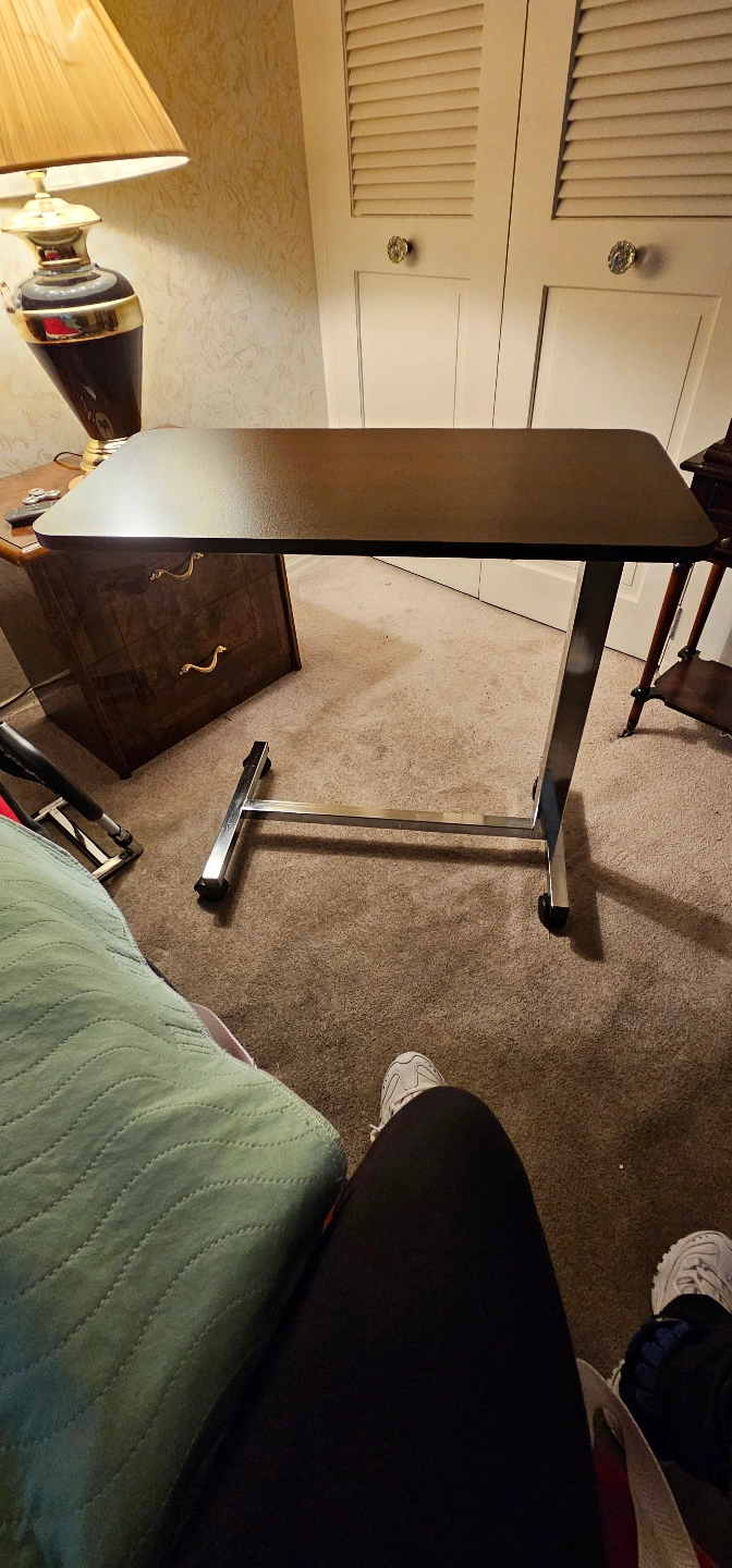10Black overbed table, chrome legs. Adjustable height. Small wheels that lock and unlock for mobility. Negotiable
