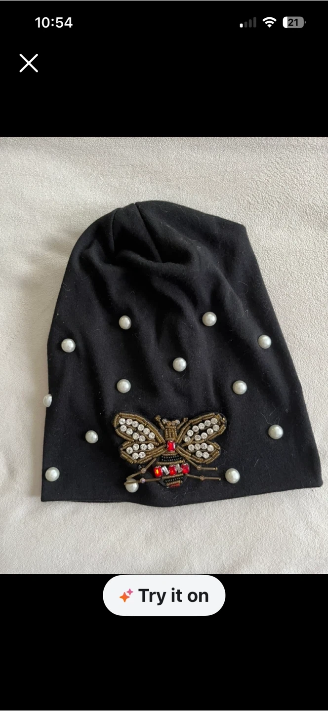 This black beanie features a detailed bee design embellished with rhinestones and red accents. It's also adorned with faux pearls scattered across the fabric. Soft material for comfort.