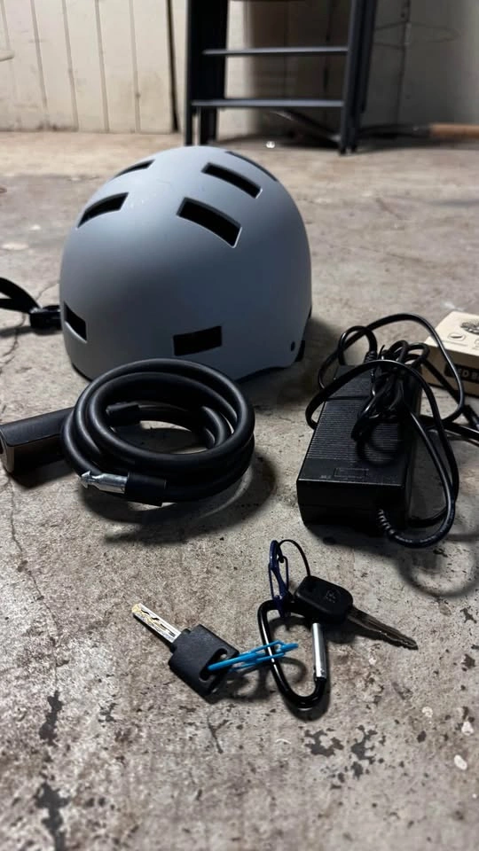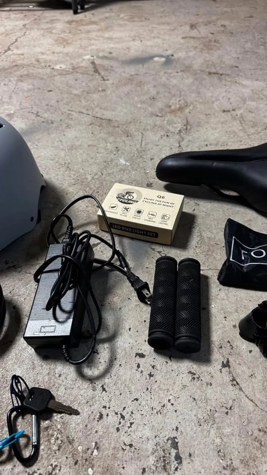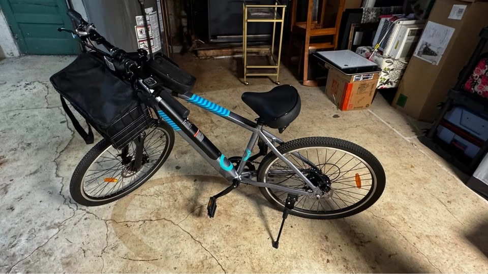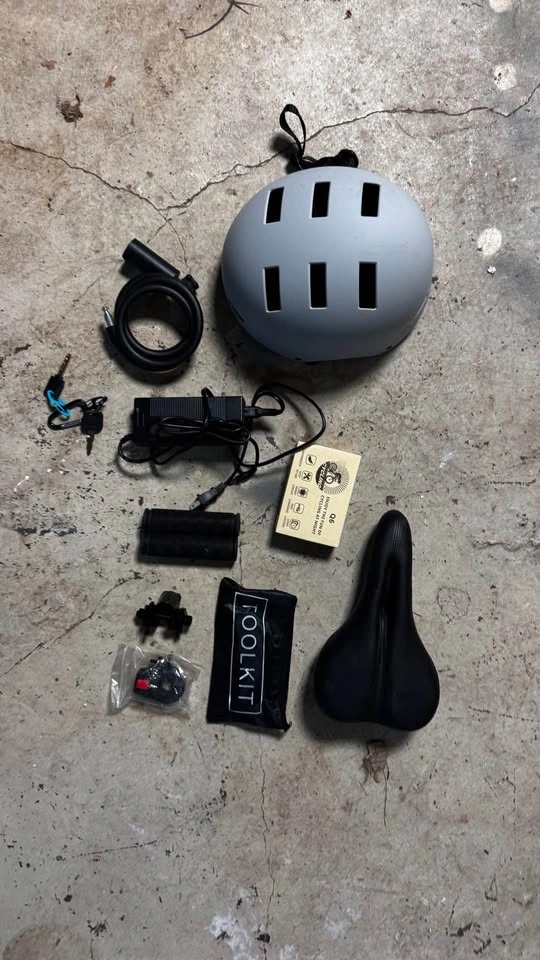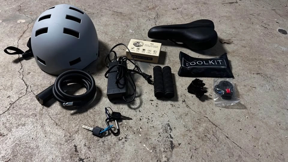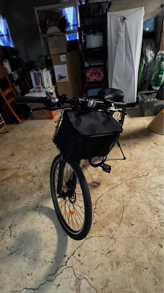 107Used adult e-bike with all accessories! Originally purchased for $500 from Walmart about 1 year ago. Replaced seat and handlebar grips, but have the originals. Battery detaches so you can store the bike and take the battery separate to charge. Accessories included: - tool set - bike lock + key - original seat & handlebar grips - helmet - front basket - small storage & phone holder - bell - bike lights (not installed)